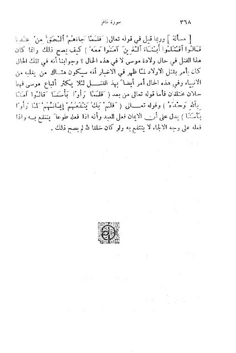 وربما قيل في قوله تعالى (فَلَمَّا جاءَهُمْ بِالْحَقِّ مِنْ عِنْدِنا قالُوا اقْتُلُوا أَبْناءَ الَّذِينَ آمَنُوا مَعَهُ) كيف يصح ذلك وانما كان هذا القتل في حال ولادة موسى لا في هذه الحال؟ وجوابنا أنه في تلك الحال كان يأمر بقتل الاولاد لمّا ظهر في الاخبار أنه سيكون هناك من يغلبه من الانبياء وفي هذه الحال أمر أيضا بهذا القتل لئلا يكثر أتباع موسى فهما حالان مختلفان فأما قوله تعالى من بعد (فَلَمَّا رَأَوْا بَأْسَنا قالُوا آمَنَّا بِاللَّهِ وَحْدَهُ) وقوله تعالى (فَلَمْ يَكُ يَنْفَعُهُمْ إِيمانُهُمْ لَمَّا رَأَوْا بَأْسَنا) يدل على أن الايمان فعل للعبد وأنه اذا فعله طوعا ينتفع به واذا فعله على وجه الالجاء لا ينتفع به ولو كان خلقا للّه لم يصح ذلك.
