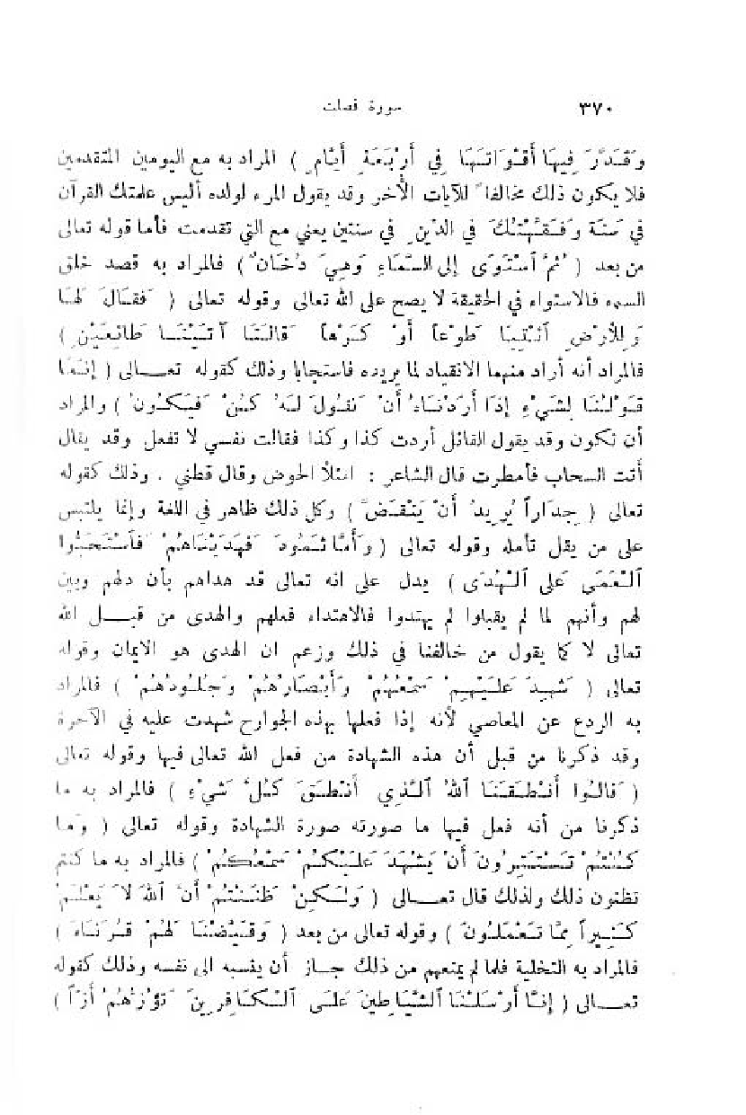 (وَ قَدَّرَ فِيها أَقْواتَها فِي أَرْبَعَةِ أَيَّامٍ) المراد به مع اليومين المتقدمين فلا يكون ذلك مخالفا للآيات الأخر وقد يقول المرء لولده أ ليس علمتك القرآن في سنة وفقّهتك في الدّين في سنتين يعني مع التي تقدمت فأما قوله تعالى من بعد (ثُمَّ اسْتَوى إِلَى السَّماءِ وهِيَ دُخانٌ) فالمراد به قصد خلق السماء فالاستواء في الحقيقة لا يصح على اللّه تعالى وقوله تعالى (فَقالَ لَها ولِلْأَرْضِ ائْتِيا طَوْعاً أَوْ كَرْهاً قالَتا أَتَيْنا طائِعِينَ) فالمراد أنه أراد منهما الانقياد لما يريده فاستجابا وذلك كقوله تعالى (إِنَّما قَوْلُنا لِشَيْءٍ إِذا أَرَدْناهُ أَنْ نَقُولَ لَهُ كُنْ فَيَكُونُ) والمراد أن تكون وقد يقول القائل أردت كذا وكذا فقالت نفسي لا تفعل وقد يقال أتت السحاب فأمطرت قال الشاعر: امتلأ الحوض وقال قطني. وذلك كقوله تعالى (جِداراً يُرِيدُ أَنْ يَنْقَضَّ) وكل ذلك ظاهر في اللغة وإنما يلتبس على من يقل تأمله وقوله تعالى (وَ أَمَّا ثَمُودُ فَهَدَيْناهُمْ فَاسْتَحَبُّوا الْعَمى عَلَى الْهُدى) يدل على انه تعالى قد هداهم بأن دلهم وبين لهم وأنهم لما لم يقبلوا لم يهتدوا فالاهتداء فعلهم والهدى من قبل اللّه تعالى لا كما يقول من خالفنا في ذلك وزعم ان الهدى هو الايمان وقوله تعالى (شَهِدَ عَلَيْهِمْ سَمْعُهُمْ وأَبْصارُهُمْ وجُلُودُهُمْ) فالمراد به الردع عن المعاصي لأنه إذا فعلها بهذه الجوارح شهدت عليه في الآخرة وقد ذكرنا من قبل أن هذه الشهادة من فعل اللّه تعالى فيها وقوله تعالى (قالُوا أَنْطَقَنَا اللَّهُ الَّذِي أَنْطَقَ كُلَّ شَيْءٍ) فالمراد به ما ذكرنا من أنه فعل فيها ما صورته صورة الشهادة وقوله تعالى (وَ ما كُنْتُمْ تَسْتَتِرُونَ أَنْ يَشْهَدَ عَلَيْكُمْ سَمْعُكُمْ) فالمراد به ما كنتم تظنون ذلك ولذلك قال تعالى (وَ لكِنْ ظَنَنْتُمْ أَنَّ اللَّهَ لا يَعْلَمُ كَثِيراً مِمَّا تَعْمَلُونَ) وقوله تعالى من بعد (وَ قَيَّضْنا لَهُمْ قُرَناءَ) فالمراد به التخلية فلما لم يمنعهم من ذلك جاز أن ينسبه الى نفسه وذلك كقوله تعالى (أَنَّا أَرْسَلْنَا الشَّياطِينَ عَلَى الْكافِرِينَ تَؤُزُّهُمْ أَزًّا)