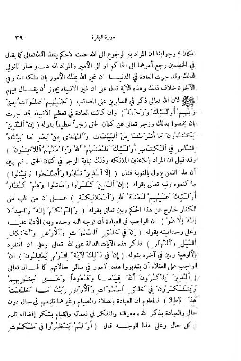 مكان، وجوابنا ان المراد به الرجوع الى اللّه حيث لا حكم ينفذ الا للّه تعالى كما يقال في الخصمين رجع أمرهما الى الحاكم او الى الأمير والمراد انه هو صار المتولي لذلك وقد جرت العادة في الدنيا ان غير اللّه يملك الأمور بان ملكه اللّه وفي الآخرة خلاف ذلك وهذه الآية تدل على ان غير الانبياء يجوز أن يقال فيهم صلّى اللّه عليه وسلم لان اللّه تعالى ذكر في الصابرين على المصائب (أُولئِكَ عَلَيْهِمْ صَلَواتٌ مِنْ رَبِّهِمْ ورَحْمَةٌ) وان كانت العادة في تعظيم الانبياء قد جرت بان يخصوا بذلك وزجر تعالى عن كتمان الحق زجرا عظيما بقوله (إِنَّ الَّذِينَ يَكْتُمُونَ ما أَنْزَلْنا مِنَ الْبَيِّناتِ والْهُدى مِنْ بَعْدِ ما بَيَّنَّاهُ لِلنَّاسِ فِي الْكِتابِ أُولئِكَ يَلْعَنُهُمُ اللَّهُ ويَلْعَنُهُمُ اللَّاعِنُونَ) وقد قيل ان المراد باللاعنين الملائكة وذلك نهاية الزجر في كتمان الحق. ثمّ بين أن هذا اللعن يزول بالتوبة فقال (إِلَّا الَّذِينَ تابُوا وأَصْلَحُوا وبَيَّنُوا) ما كتموه ونبه تعالى بقوله (إِنَّ الَّذِينَ كَفَرُوا وماتُوا وهُمْ كُفَّارٌ أُولئِكَ عَلَيْهِمْ لَعْنَةُ اللَّهِ والْمَلائِكَةِ) على ان من تاب من الكفار خارج عن هذا الحكم وبين تعالى بقوله (وَ إِلهُكُمْ إِلهٌ واحِدٌ لا إِلهَ إِلَّا هُوَ) ان الواجب في العبادة أن توجه اليه وحده وبين الأدلة عليه وعلى وحدانيته بقوله (إِنَّ فِي خَلْقِ السَّماواتِ والْأَرْضِ واخْتِلافِ اللَّيْلِ والنَّهارِ) فذكر هذه الآيات الدالة على اللّه تعالى وعلى ان المنفرد بالألوهية وبين في آخره بقوله (إِنَّ فِي ذلِكَ لَآيَةً لِقَوْمٍ يَعْقِلُونَ) انّ الواجب على العقلاء أن يتدبروا هذه الامور في سائر حالاتهم كما قال تعالى (الَّذِينَ يَذْكُرُونَ اللَّهَ قِياماً وقُعُوداً وعَلى جُنُوبِهِمْ ويَتَفَكَّرُونَ فِي خَلْقِ السَّماواتِ والْأَرْضِ رَبَّنا ما خَلَقْتَ هذا باطِلًا) فالمعلوم ان العبادة بالصلاة والصيام وغيرهما تلزمهم في حال دون حال والعبادة بذكر اللّه ومعرفته والتفكر في نعمائه والقيام بشكر إفضاله تلزم في كل حال وعلى هذا الوجه قال (أَ ولَمْ يَنْظُرُوا فِي مَلَكُوتِ