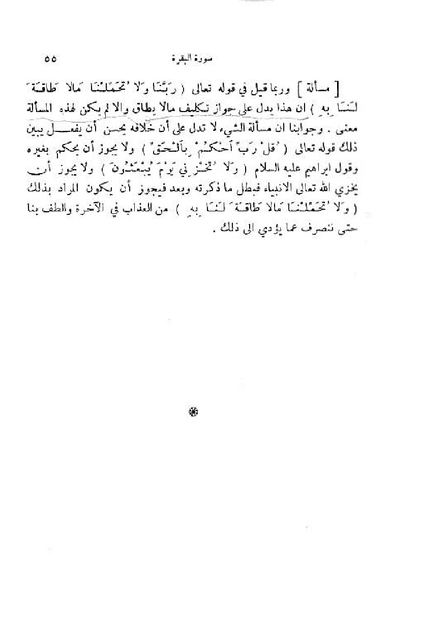 وربما قيل في قوله تعالى (رَبَّنا ولا تُحَمِّلْنا ما لا طاقَةَ لَنا بِهِ) ان هذا يدل على جواز تكليف ما لا يطاق والا لم يكن لهذه المسألة معنى. وجوابنا ان مسألة الشيء لا تدل على أن خلافه يحسن أن يفعل يبين ذلك قوله تعالى (قالَ رَبِّ احْكُمْ بِالْحَقِّ) ولا يجوز أن يحكم بغيره وقول ابراهيم عليه السلام (وَ لا تُخْزِنِي يَوْمَ يُبْعَثُونَ) ولا يجوز أن يخزي اللّه تعالى الانبياء فبطل ما ذكرته وبعد فيجوز أن يكون المراد بذلك (وَ لا تُحَمِّلْنا ما لا طاقَةَ لَنا بِهِ) من العذاب في الآخرة والطف بنا حتى ننصرف مما يؤدي الى ذلك.