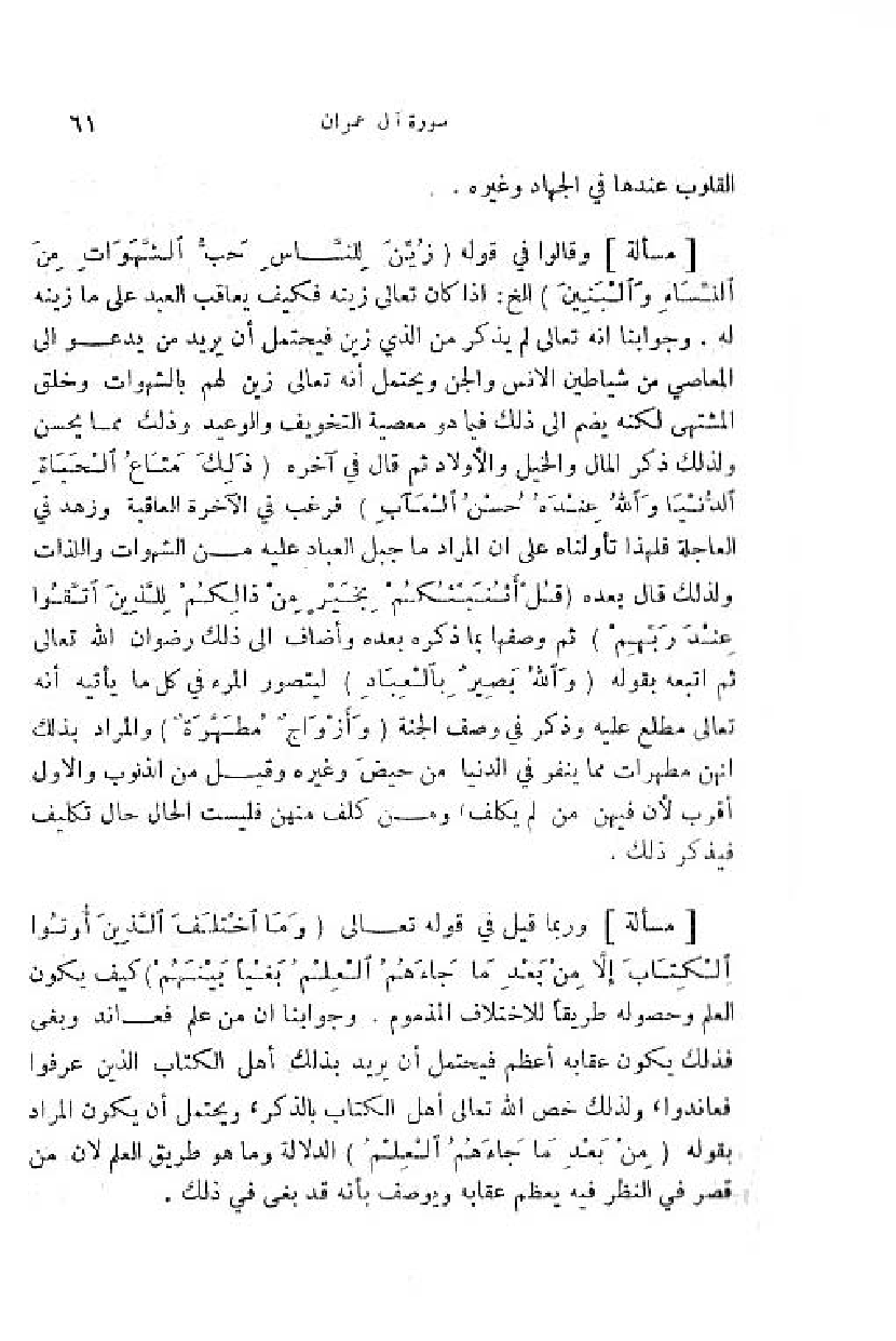 وقالوا في قوله (زُيِّنَ لِلنَّاسِ حُبُّ الشَّهَواتِ مِنَ النِّساءِ والْبَنِينَ) الخ: اذا كان تعالى زينه فكيف يعاقب العبد على ما زينه له. وجوابنا انه تعالى لم يذكر من الذي زين فيحتمل أن يريد من يدعو الى المعاصي من شياطين الانس والجن ويحتمل أنه تعالى زين لهم بالشهوات وخلق المشتهى لكنه يضم الى ذلك فيما هو معصية التخويف والوعيد وذلك مما يحسن ولذلك ذكر المال والخيل والأولاد ثمّ قال في آخره (ذلِكَ مَتاعُ الْحَياةِ الدُّنْيا واللَّهُ عِنْدَهُ حُسْنُ الْمَآبِ) فرغب في الآخرة العاقبة وزهد في العاجلة فلهذا تأولناه على ان المراد ما جبل العباد عليه من الشهوات واللذات ولذلك قال بعده (قُلْ أَ أُنَبِّئُكُمْ بِخَيْرٍ مِنْ ذلِكُمْ لِلَّذِينَ اتَّقَوْا عِنْدَ رَبِّهِمْ) ثمّ وصفها بما ذكره بعده وأضاف الى ذلك رضوان اللّه تعالى ثمّ اتبعه بقوله (وَ اللَّهُ بَصِيرٌ بِالْعِبادِ) ليتصور المرء في كل ما يأتيه أنه تعالى مطلع عليه وذكر في وصف الجنة (وَ أَزْواجٌ مُطَهَّرَةٌ) والمراد بذلك انهن مطهرات مما ينفر في الدنيا من حيض وغيره وقيل من الذنوب والاول أقرب لأن فيهن من لم يكلف، ومن كلف منهن فليست الحال حال تكليف فيذكر ذلك.