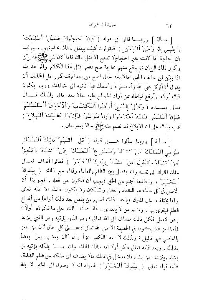 وربما قالوا في قوله (فَإِنْ حَاجُّوكَ فَقُلْ أَسْلَمْتُ وَجْهِيَ لِلَّهِ ومَنِ اتَّبَعَنِ) فيقولون كيف يبطل بذلك محاجتهم. وجوابنا ان المحاجة اذا كانت بغير الحجاج لا تدفع الا بمثل ذلك فاذا كان النبي صلّى اللّه عليه وسلم قد بيّن وكرر ذلك البيان ثمّ وقع منهم محاجة صح دفعها بمثل هذا الكلام والواحد منا اذا بيّن لمن خالف الحق حالا بعد حال لصح من بعد؛ وقد كرر على المخالف أن يقول أنا أتوكل على اللّه وأستسلم له وأسلمك فيما تأتيه الى خالقك وربما يكون ذلك أوكد وأرفع لباطله ممن أراد الحجاج عليه حالا بعد حال ولذلك قال تعالى بعده (وَ قُلْ لِلَّذِينَ أُوتُوا الْكِتابَ والْأُمِّيِّينَ أَ أَسْلَمْتُمْ فَإِنْ أَسْلَمُوا فَقَدِ اهْتَدَوْا وإِنْ تَوَلَّوْا فَإِنَّما عَلَيْكَ الْبَلاغُ) فنبه بذلك على ان الابلاغ قد تقدم منه صلّى اللّه عليه وسلم حالا بعد حال.