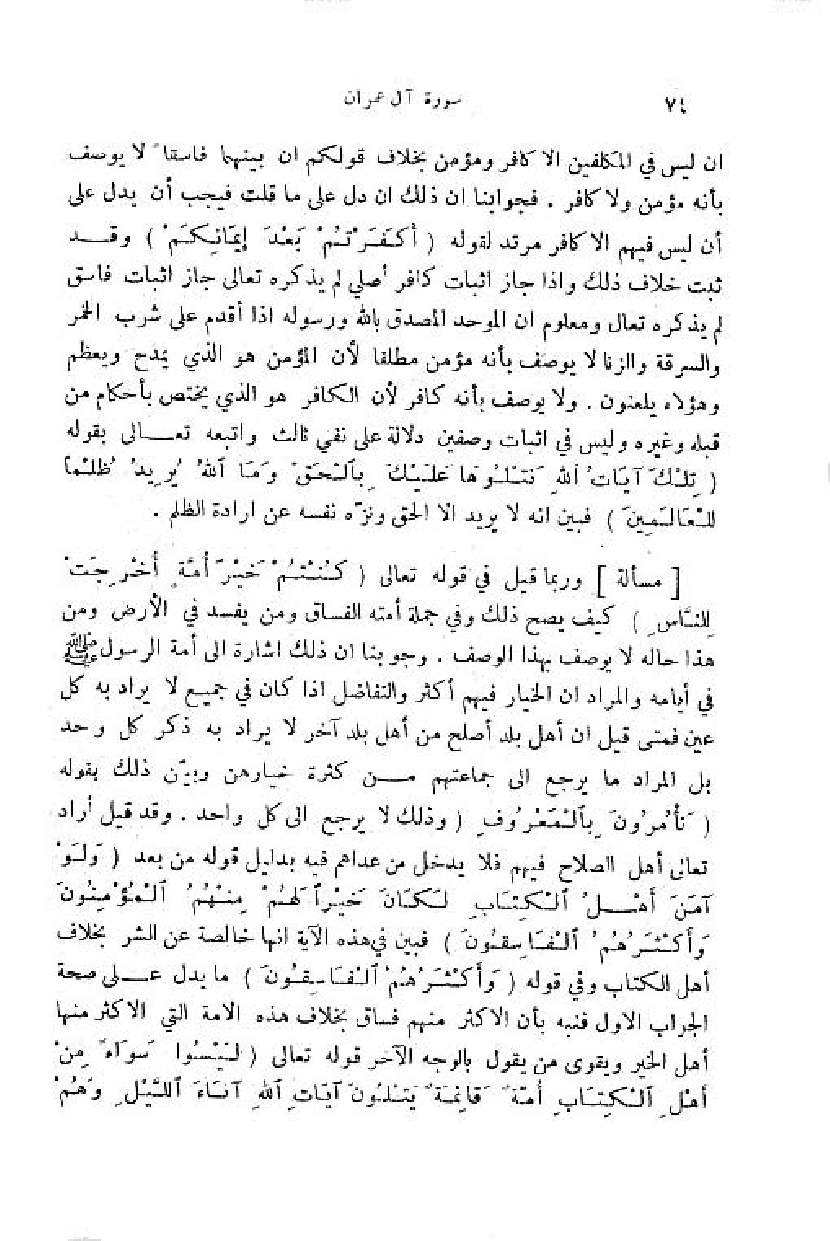 وربما قيل في قوله تعالى (كُنْتُمْ خَيْرَ أُمَّةٍ أُخْرِجَتْ لِلنَّاسِ) كيف يصح ذلك وفي جملة أمته الفساق ومن يفسد في الأرض ومن هذا حاله لا يوصف بهذا الوصف. وجوابنا ان ذلك اشارة الى أمة الرسول صلّى اللّه عليه وسلم في أيامه والمراد ان الخيار فيهم أكثر والتفاضل اذا كان في جميع لا يراد به كل عين فمتى قيل ان أهل بلد أصلح من أهل بلد آخر لا يراد به ذكر كل واحد بل المراد ما يرجع الى جماعتهم من كثرة خيارهن وبيّن ذلك بقوله (تَأْمُرُونَ بِالْمَعْرُوفِ) وذلك لا يرجع الى كل واحد. وقد قيل أراد تعالى أهل الصلاح فيهم فلا يدخل من عداهم فيه بدليل قوله من بعد (وَ لَوْ آمَنَ أَهْلُ الْكِتابِ لَكانَ خَيْراً لَهُمْ مِنْهُمُ الْمُؤْمِنُونَ وأَكْثَرُهُمُ الْفاسِقُونَ) فبين في هذه الآية انها خالصة عن الشر بخلاف أهل الكتاب وفي قوله (وَ أَكْثَرُهُمُ الْفاسِقُونَ) ما يدل على صحة الجواب الاول فنبه بأن الاكثر منهم فساق بخلاف هذه الامة التي الاكثر منها أهل الخير ويقوى من يقول بالوجه الآخر قوله تعالى (لَيْسُوا سَواءً مِنْ أَهْلِ الْكِتابِ أُمَّةٌ قائِمَةٌ يَتْلُونَ آياتِ اللَّهِ آناءَ اللَّيْلِ وهُمْ)