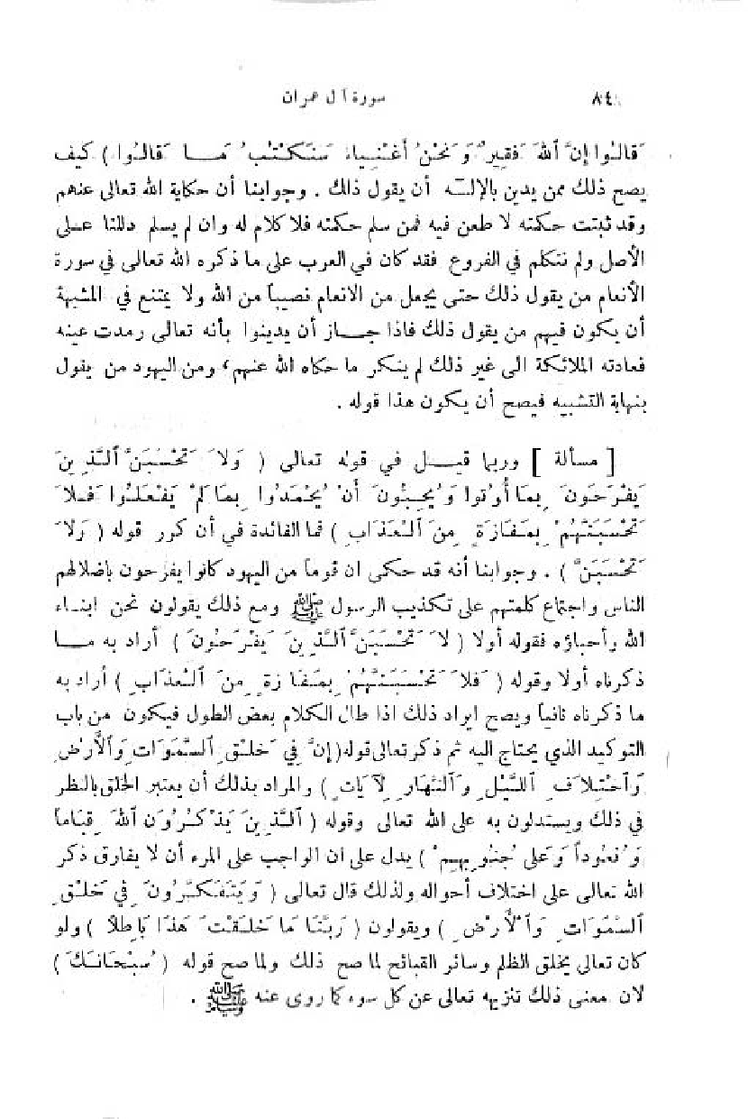 وربما قيل في قوله تعالى (لا تَحْسَبَنَّ الَّذِينَ يَفْرَحُونَ بِما أَتَوْا ويُحِبُّونَ أَنْ يُحْمَدُوا بِما لَمْ يَفْعَلُوا فَلا تَحْسَبَنَّهُمْ بِمَفازَةٍ مِنَ الْعَذابِ) فما الفائدة في أن كرر قوله (وَ لا تَحْسَبَنَّ). وجوابنا أنه قد حكى ان قوما من اليهود كانوا يفرحون باضلالهم الناس واجتماع كلمتهم على تكذيب الرسول صلّى اللّه عليه وسلم ومع ذلك يقولون نحن ابناء اللّه وأحباؤه فقوله أولا (لا تَحْسَبَنَّ الَّذِينَ يَفْرَحُونَ) أراد به ما ذكرناه أولا وقوله (فَلا تَحْسَبَنَّهُمْ بِمَفازَةٍ مِنَ الْعَذابِ) أراد به ما ذكرناه ثانيا ويصح ايراد ذلك اذا طال الكلام بعض الطول فيكون من باب التوكيد الذي يحتاج اليه ثمّ ذكر تعالى قوله (إِنَّ فِي خَلْقِ السَّماواتِ والْأَرْضِ واخْتِلافِ اللَّيْلِ والنَّهارِ لَآياتٍ) والمراد بذلك أن يعتبر الخلق بالنظر في ذلك ويستدلون به على اللّه تعالى وقوله (الَّذِينَ يَذْكُرُونَ اللَّهَ قِياماً وقُعُوداً وعَلى جُنُوبِهِمْ) يدل على ان الواجب على المرء أن لا يفارق ذكر اللّه تعالى على اختلاف أحواله ولذلك قال تعالى (وَ يَتَفَكَّرُونَ فِي خَلْقِ السَّماواتِ والْأَرْضِ) ويقولون (رَبَّنا ما خَلَقْتَ هذا باطِلًا) ولو كان تعالى يخلق الظلم وسائر القبائح لما صح ذلك ولما صح قوله (سُبْحانَكَ) لان معنى ذلك تنزيهه تعالى عن كل سوء كما روى عنه صلّى اللّه عليه وسلم.