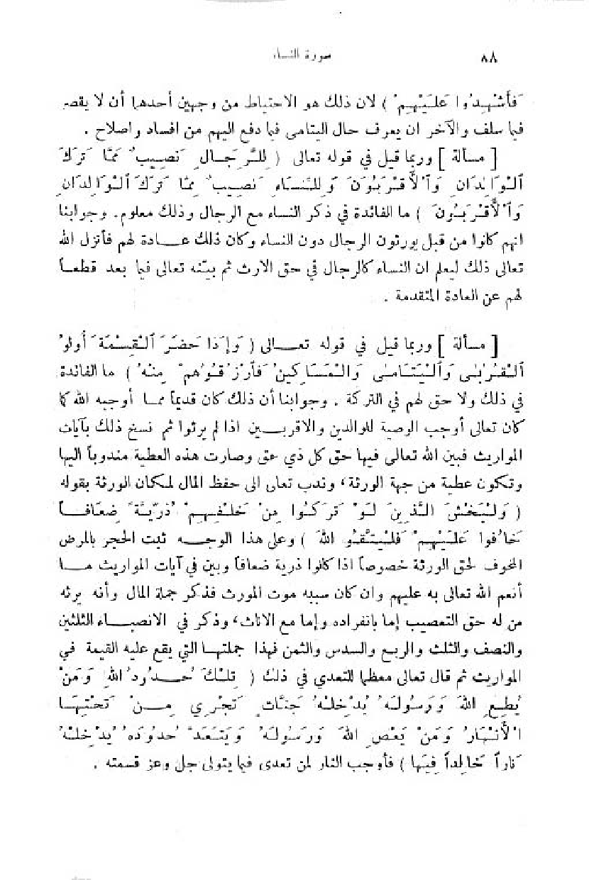 وربما قيل في قوله تعالى (وَ إِذا حَضَرَ الْقِسْمَةَ أُولُوا الْقُرْبى والْيَتامى والْمَساكِينُ فَارْزُقُوهُمْ مِنْهُ) ما الفائدة في ذلك ولا حق لهم في التركة. وجوابنا أن ذلك كان قديما مما أوجبه اللّه كما كان تعالى أوجب الوصية للوالدين والاقربين اذا لم يرثوا ثمّ نسخ ذلك بآيات المواريث فبين اللّه تعالى فيها حق كل ذي حق وصارت هذه العطية مندوبا اليها وتكون عطية من جهة الورثة، وندب تعالى الى حفظ المال لمكان الورثة بقوله (وَ لْيَخْشَ الَّذِينَ لَوْ تَرَكُوا مِنْ خَلْفِهِمْ ذُرِّيَّةً ضِعافاً خافُوا عَلَيْهِمْ فَلْيَتَّقُوا اللَّهَ) وعلى هذا الوجه ثبت الحجر بالمرض المخوف لحق الورثة خصوصا اذا كانوا ذرية ضعافا وبين في آيات المواريث ما أنعم اللّه تعالى به عليهم وان كان سببه موت المورث فذكر جملة المال وأنه يرثه من له حق التعصيب إما بانفراده وإما مع الاناث، وذكر في الانصباء الثلثين والنصف والثلث والربع والسدس والثمن فهذا جملتها التي يقع عليه القيمة في المواريث ثمّ قال تعالى معظما للتعدي في ذلك (تِلْكَ حُدُودُ اللَّهِ ومَنْ يُطِعِ اللَّهَ ورَسُولَهُ يُدْخِلْهُ جَنَّاتٍ تَجْرِي مِنْ تَحْتِهَا الْأَنْهارُ) (وَ مَنْ يَعْصِ اللَّهَ ورَسُولَهُ ويَتَعَدَّ حُدُودَهُ يُدْخِلْهُ ناراً خالِداً فِيها) فأوجب النار لمن تعدى فيما يتولى جل وعز قسمته.