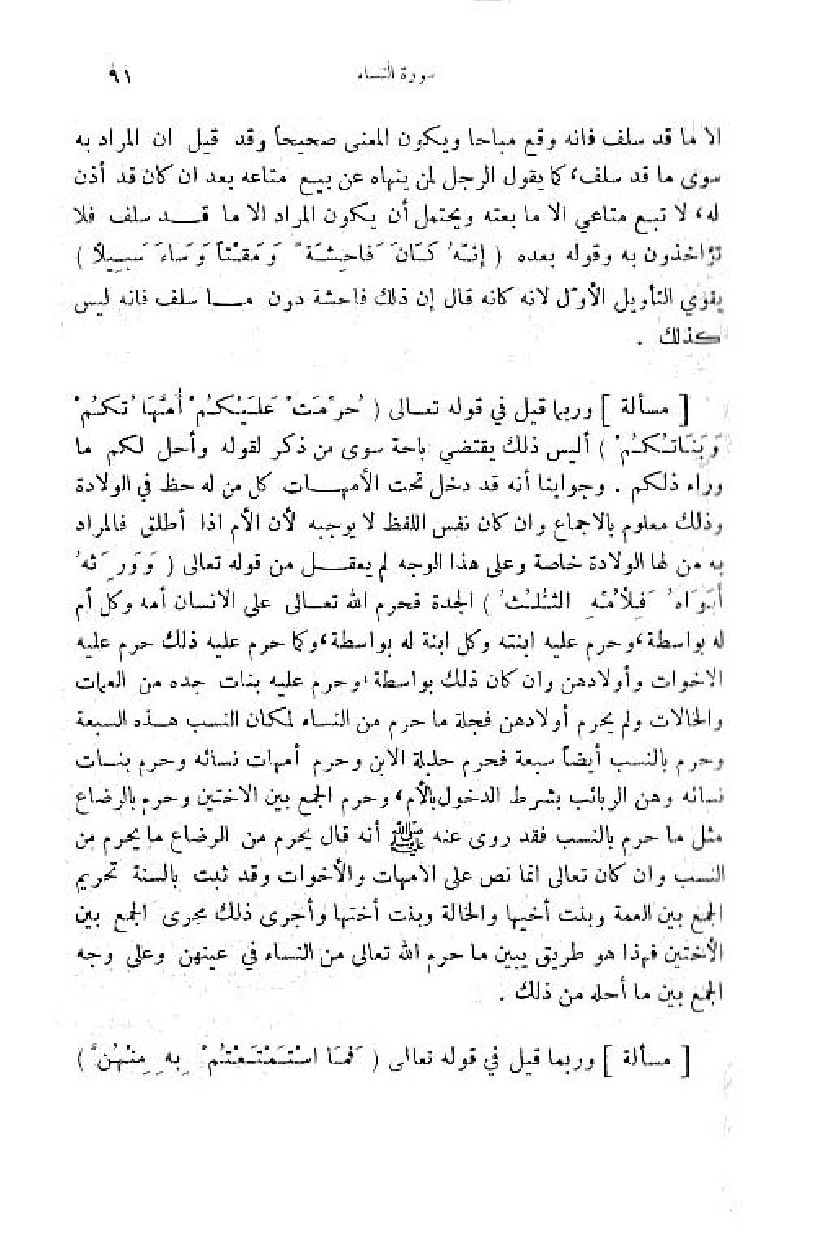وربما قيل في قوله تعالى (حُرِّمَتْ عَلَيْكُمْ أُمَّهاتُكُمْ وبَناتُكُمْ) أ ليس ذلك يقتضي اباحة سوى من ذكر لقوله وأحل لكم ما وراء ذلكم. وجوابنا أنه قد دخل تحت الأمهات كل من له حظ في الولادة وذلك معلوم بالاجماع وان كان نفس اللفظ لا يوجبه لأن الأم اذا أطلق فالمراد به من لها لولادة خاصة وعلى هذا الوجه لم يعقل من قوله تعالى (وَ وَرِثَهُ أَبَواهُ فَلِأُمِّهِ الثُّلُثُ) الجدة فحرم اللّه تعالى على الانسان أمه وكل أم له بواسطة، وحرم عليه ابنته وكل ابنة له بواسطة، وكما حرم عليه ذلك حرم عليه الاخوات وأولادهن وان كان ذلك بواسطة، وحرم عليه بنات جده من العمات والخالات ولم يحرم أولادهن فجلة ما حرم من النساء لمكان النسب هذه السبعة وحرم بالنسب أيضا سبعة فحرم حليلة الابن وحرم أمهات نسائه وحرم بنات نسائه وهن الربائب بشرط الدخول بالأم، وحرم الجمع بين الاختين وحرم بالرضاع مثل ما حرم بالنسب فقد روى عنه صلّى اللّه عليه وسلم أنه قال يحرم من الرضاع ما يحرم من النسب وان كان تعالى انما نص على الامهات والأخوات وقد ثبت بالسنة تحريم الجمع بين العمة وبنت أخيها والخالة وبنت أختها وأجرى ذلك مجرى الجمع بين الأختين فهذا هو طريق يبين ما حرم اللّه تعالى من النساء في عينهن وعلى وجه الجمع بين ما أحله من ذلك.