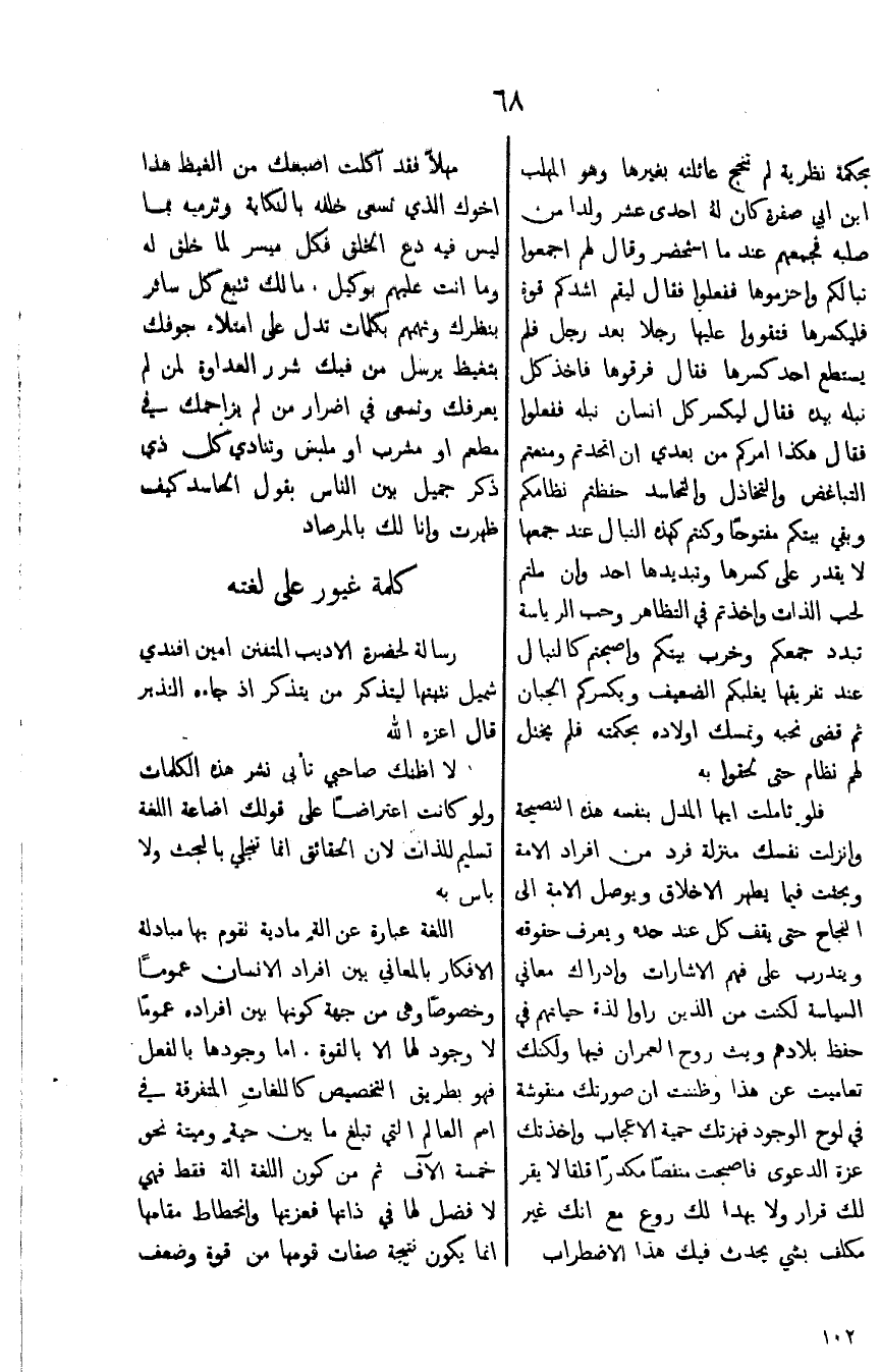 فلو تاملت ايها المدل بنفسه هذه النصيحة وانزلت نفسك منزلة فرد من افراد الامة وبحثت فيما يطهر الاخلاق ويوصل الامة الى النجاح حتى يقف كل عند حده ويعرف حقوقه ويتدرب على فهم الاشارات وادراك معاني السياسة لكنت من الذين راوا لذة حياتهم في حفظ بلادهم وبث روح العمران فيها ولكنك تعاميت عن هذا وظننت ان صورتك منقوشة في لوح الوجود فهزتك حمية الاعجاب واخذتك عزة الدعوى فاصبحت منفضاً مكدراً قلقا لايقر لك قرار ولا يهدا لك روع مع انك غير مكلف بشي يحدث فيك هذا الاضطراب