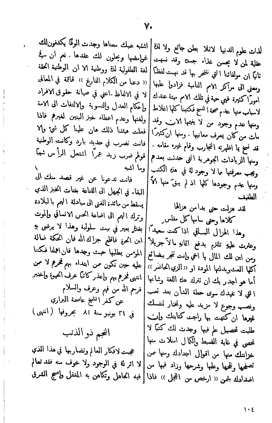 علم فيها وجدت لك كتباً لاتحصى في غاية الضبط والكمال امتلأت منها خزانتك منها من اقوال اجدادك ومنها ممن تصفحها وتفتحها وعلمها وشرحها وزاد فيها ن اضدادك بثمن ((ارخص من الفجل)) فاذا اشتبه عليك معناها وجدت الوفا يكشفون لك غوامضها ويحلون لك عقدها. نعم ان في لغة الطفولية لذة ووطنية الا ان الوطنية الحقة ((دعنا من الكلام الفارغ)) قائمة في المعاني لافي الألفاظ. اعني في صيانة حقوق الافراد واحكام العدل والتسوية والالتفات الى الامة ولغتها وعدم اعطاء خبز البنين لغيرهم فاذا فعلت هيئتنا ذلك هان علينا كل شيء والا فانت تضرب في حديد بارد وكانت الوطنية قولهم ضرب زيد عمراً اشتعل الرأس شيباً وما اشبه
