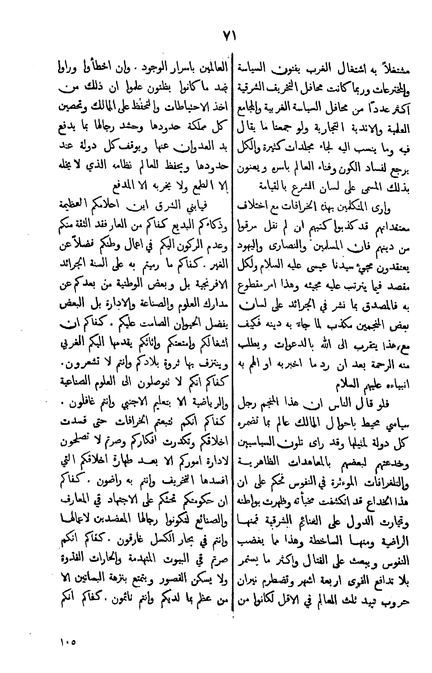 وارى المتكلمين بهذه الخرافات مع اختلاف معتقداتهم قد كذبوا كتبهم ان لم نقل مرقوا من دينهم فان المسلمين والنصارى واليهود يعتقدون مجيء سيدنا عيسى عليه السلام ولكل مقصد فيما يترتب عليه مجيئه وهذا امر مقطوع به فالمصدق بما نشر في الجرائد على لسان بعض المنجمين مكذب لما جاء به دينه فكيف مع هذا يتقرب الى الله بالدعوات ويطلب منه الرحمة بعد ان رد ما اخبربه او الهم به انبياءه عليهم السلام