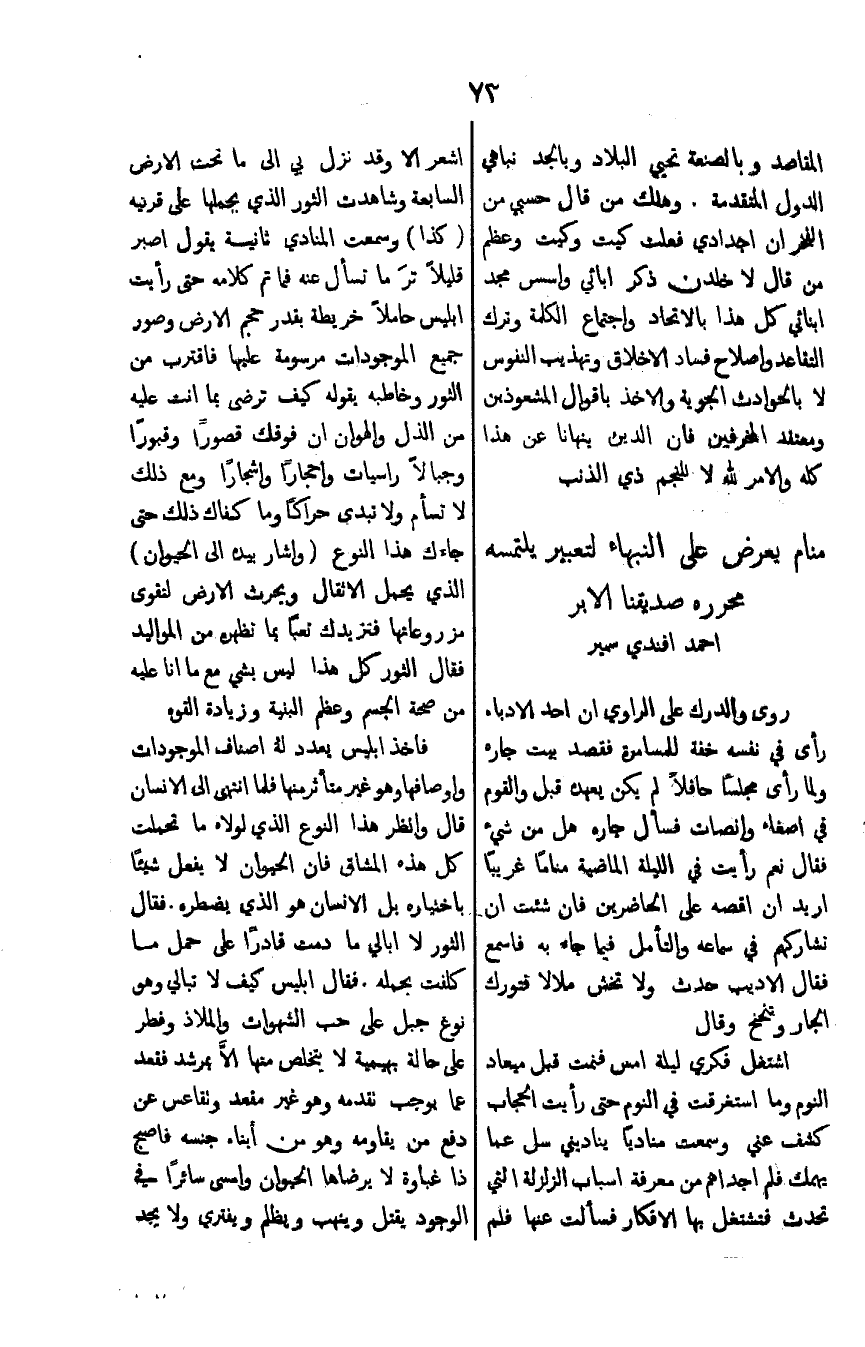روى والدرك على الراوي ان احد الادباء رأى في نفسه خفة للمسامرة فقصد بيت جاره ولما رأى مجلساً حافلاً لم يكن بعهده قبل والقوم في اصغاء وانصات فسأل جاره هل من شئ فقال نعم رأيت في الليلة الماضية مناماً غريباً اريد ان اقصه على الحاضرين فان شئت ان تشاركهم في سماعه التأمل في ما جاء به فاسمع فقال الاديب حدث ولا تخش ملالا فتورك وتنحنح وقال اشتغل فكري ليلة امس فنمت قبل ميعاد النوم وما استغرقت في النوم حتى رأيت الحجاب كشف عني وسمعت منادياً يناديني سل عما يهمك فلم اجد اهم من معرفة اسباب الزلزلة التي تحدث فتشتغل بها الافكار فسألت عنها فلم اشعر الا وقد نزل بي الى ماتحت الارض السابعة وشاهدت الثور الذي يحملها على قرية (كذا) وسمعت المنادي ثانية يقول اصبر قليلاًً تر ماتسأل عنه فما تم كلامه حتى رأيت ابليس حاملاً خريطة بقدر حجم الارض وصور جميع الموجودات مرسومة عليها فاقترب من الثور وخاطبه بقوله كيف ترضى بما انت عليه من الذل والهوان ان فوقك قصوراً وقبوراً وجبالاً راسيات واحجاراً واشجاراً ومع ذلك لاتسأم ولا تبدي حراكاً وما كفاك ذلك حتى جاءك هذا النوع (واشار بيده الى الحيوان) الذي يحمل الاثقال ويحرث الارض لتقوى مزروعاتها فتزيدك تعباً بما تظهره من المواليد فقال الثور كل هذا ليس بشي مع ما انا عليه من صحة الجسم وعظم البنية وزيادة القوه فاخذ ابليس يعدد لهُ اصناف الموجودات واوصافها وهو غير متأثر منها فلما انتهى الى الانسان قال وانظر هذا النوع الذي لولاه ما تحملت كل هذه المشاق فان الحيوان لايفعل شياً باختياره بل الانسان هو الذي يضطره. فقال الثور لا ابالي ما دمت قادراً على حمل ما كفلت بحمله. فقال ابليس كيف لا تبالي وهو نوع جبل على حب الشهوات والملاذ وفطر على حالة بهيمية لايتخلص منها الا بمرشد فقعد عما يوجب تقدمه وهو غير مقعد وتقاعس عن دفع من يقاومه وهو من ابناء جنسه فاصبح ذا غباوة لايرضاها الحيوان وامسى سائراً في الوجود يقتل وينهب ويظلم ويفتري ولا يجد