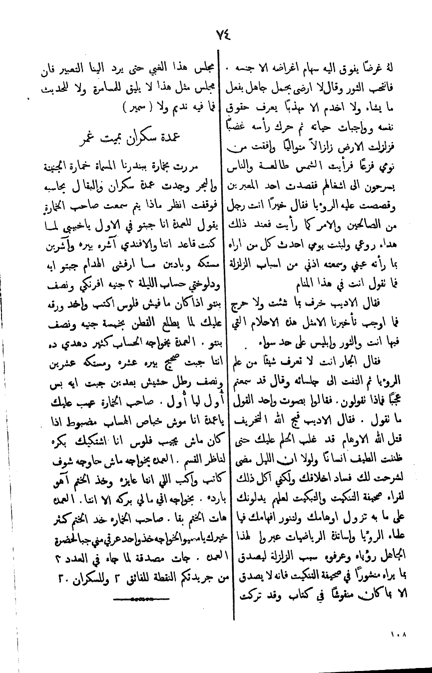 مررت بخمارة ببندرنا المسماة خمارة الجنينة والبحر وجدت عمدة سكران والبقال يحاسبه فوقفت انظر ماذا يتم سمعت صاحب الخمارة يقول للعمدة انا جبتو في الاول ياخبيبي لما كنت قاعد انتا والافندي آشره بيره وآشرين مستكة وبادين ما ارفشى الهدام جبتو ايه ودلوختي حساب الليلة 3 جنيه افرنكي ونصف بنتو اذا كان مفيش فلوس اكتب واخذ ورقة عليك لما يطلع القطن بخمسة جنيه ونصف بنتو. العمدة يخواجه الحساب كثير دهدي ده انتا جبت صحيح بيره عشره ومستكة عشرين ونصف رطل حشيش بعدين جبت ايه بس أُول ليا أُول. صاحب الخمارة عيب عليك ياعمدة انا موش خباص الهساب مضبوط اذا كان ماش يجيب فلوس انا اشتكيك بكره لناظر القسم. العمده يخواجه ماش حاوجه شوف كاتب واكب اللي انتا عايزه وخذ الختم آهو باردة. يخواجه اني مالي بركه الا انتا. العمدة هات الختم بقا. صاحب الخماره خد الختم كثر خيرك يا مسيو الخواجه خذ واحد عرقي مني جبا لحضرة العمده. جات مصدقة لما جاء في العدد 3 من جريدتكم النقطة للفائق 2 وللسكران 20