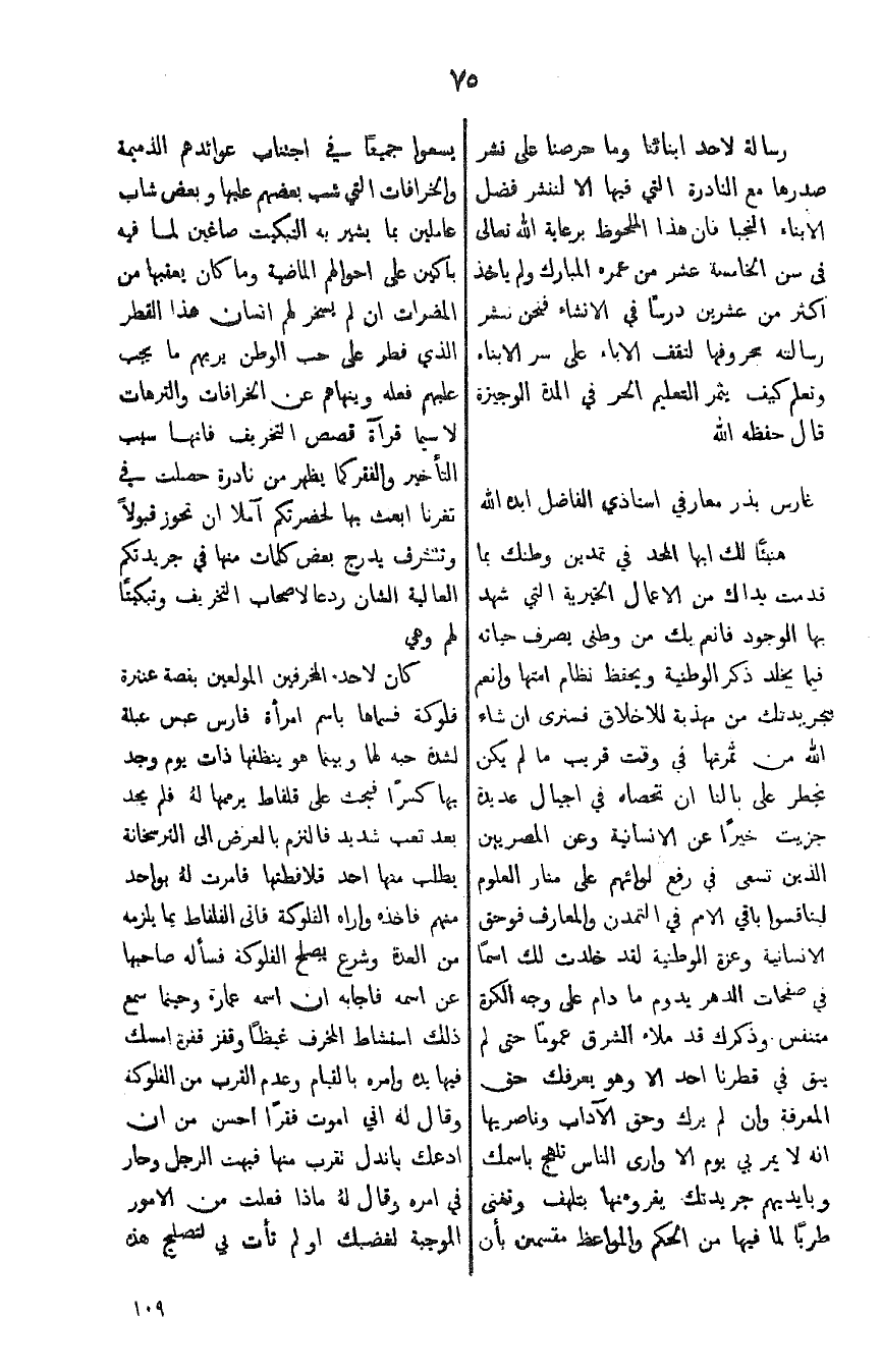 غارس بذر معارفي استاذي الفاضل ايده الله هنيئاً لك ايها المجد في تمدين وطنك بما قدمت يداك من الاعمال الخيرية التي شهد بها الوجود فانعم بك من وطني يصرف حياته فيما يخلد ذكر الوطنية ويحفظ نظام امتها وانعم بحريتك من مهذبة للاخلاق فسنرى ان شاء الله من ثمرتها في وقت قريب مالم يكن يخطر على بالنا ان نحصله في اجيال عديدة جزيت خيراً عن الانسانية وعن المصريين الذين نسعى في رفع لوائهم على منار العلوم لينافسوا باقي الامم في التمدن والمعارف فوحق الانسانية وعزة الوطنية لقد خلدت لك اسماً في صفحات الدهر يدوم ما دام على وجه الكرة مننفس وذكرك قد ملاه الشرق عموماً حتى لم يبق في قطرنا احد الا وهو يعرفك حق المعرفة وان لم يرك وحق الآداب وناصريها انه لايمر بي يوم الا وارى الناس تلهج باسمك وبايديهم جريدتك يقرو منها بتلهف وتغنى طرباً لما فيها من الحكم والمواعظ مقسمين بان يسعوا جميعاً في اجتناب عوائدهم الذميمة والخرافات التي شب بعضهم عليها وبعض شاب عاملين بما يشير به التبكيت صاغين لما فيه باكين على احوالهم الماضية وما كان يعقبها من المضرات ان لم يسخر لهم الانسان هذا القطر الذي فطر على حب الوطن يريهم ما يجب عليهم فعله وينهاهم عن الخرافات والترهات لاسيما قرآة قصص التخريف فانها سبب التاخير والفقر كما يظهر من نادرة حصلت في ثغرنا ابعث بها لحضرتكم آملا ان تحوز قبولاً وتتشرف يدرج بعض كلمات منها في جريدتكم العالية الشان ردعاً لاصحاب التخريف وتبكيتاً لهم وهي كان لاحد المخرفين المولعين بقصة عنترة فلوكة فسماها باسم امرأة فارس عبس عبلة لشدة حبه لها وبنما هو ينظفها ذات يوم وجد بها كسراً فبحث على قلفاظ يرممها لهُ فلم يجد بعد تعب شديد فالتزم بالعرض الى الترسخانة يطلب منها احد قلافطتها فامرت لهُ بواحد منهم فاخذه واراه الفلوكة فاتى القلفاط بما يلزمه من العدة وشرع يصلح الفلوكة فسأله صاحبها عن اسمه فاجابه ان اسمه عمارة وحينما سمع ذلك استشاط المخرف غيظاً وقفز قفرة امسك فيها