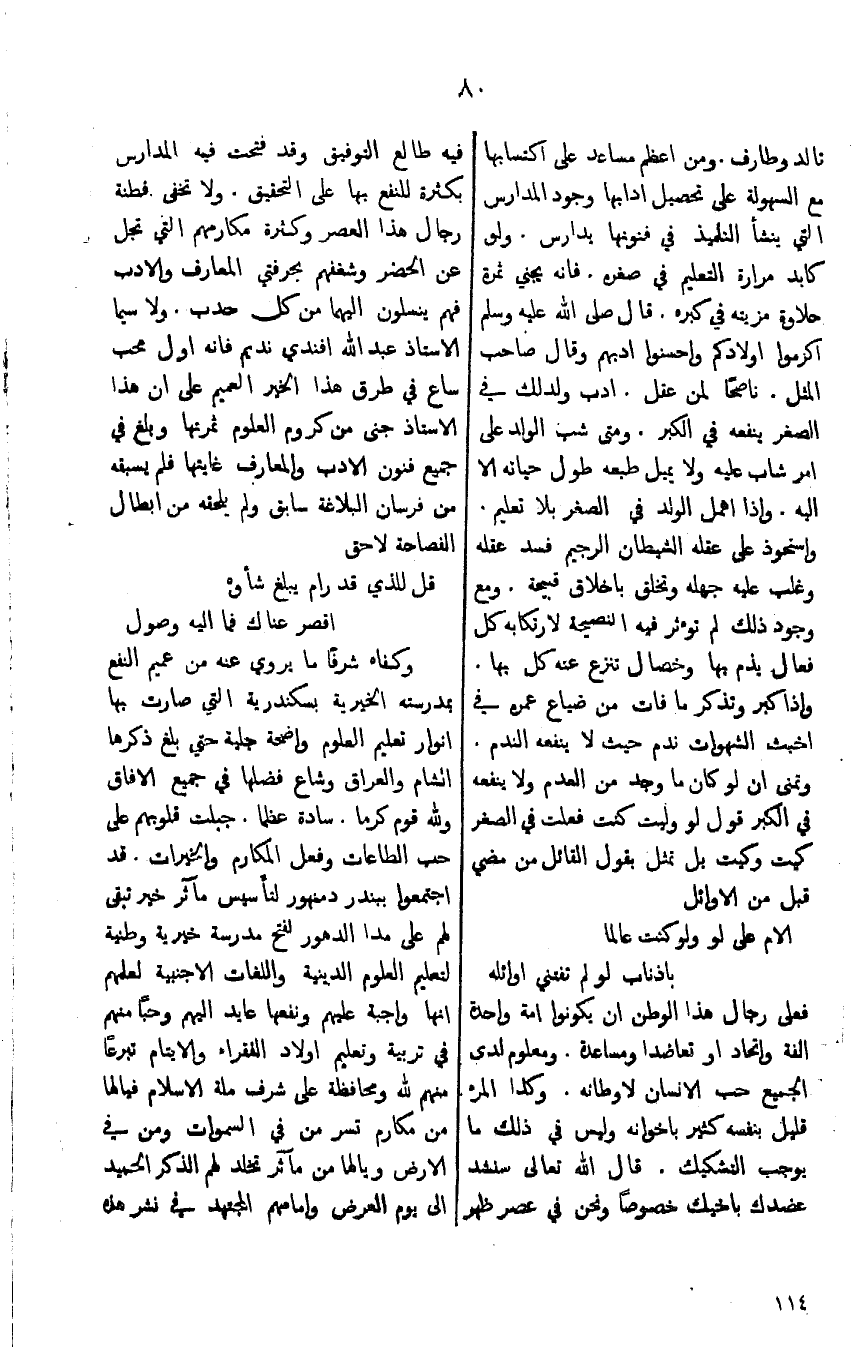 فيه طالع التوفيق وقد فتحت فيه المدارس بكثرة للنفع بها على التحقيق. ولا تخفى فطنة رجال هذا العصر وكثرة مكارمهم التي تجل عن الحصر وشغفهم بحرفتي المعارف والاداب فهم ينسلون اليهما من كل حدب. ولاسيما الاستاذ عبد الله افندي نديم فانه اول محب ساع في ق هذا الخير الميم على انه هذا الاستاذ جنى من كروم العلوم ثمرتها وبلغ في جميع فنون الادب والمعارف غايتها فلم يسبقه من فرسان البلاغة سابق ولم يلحقه من ابطال الفصاحة لاحق