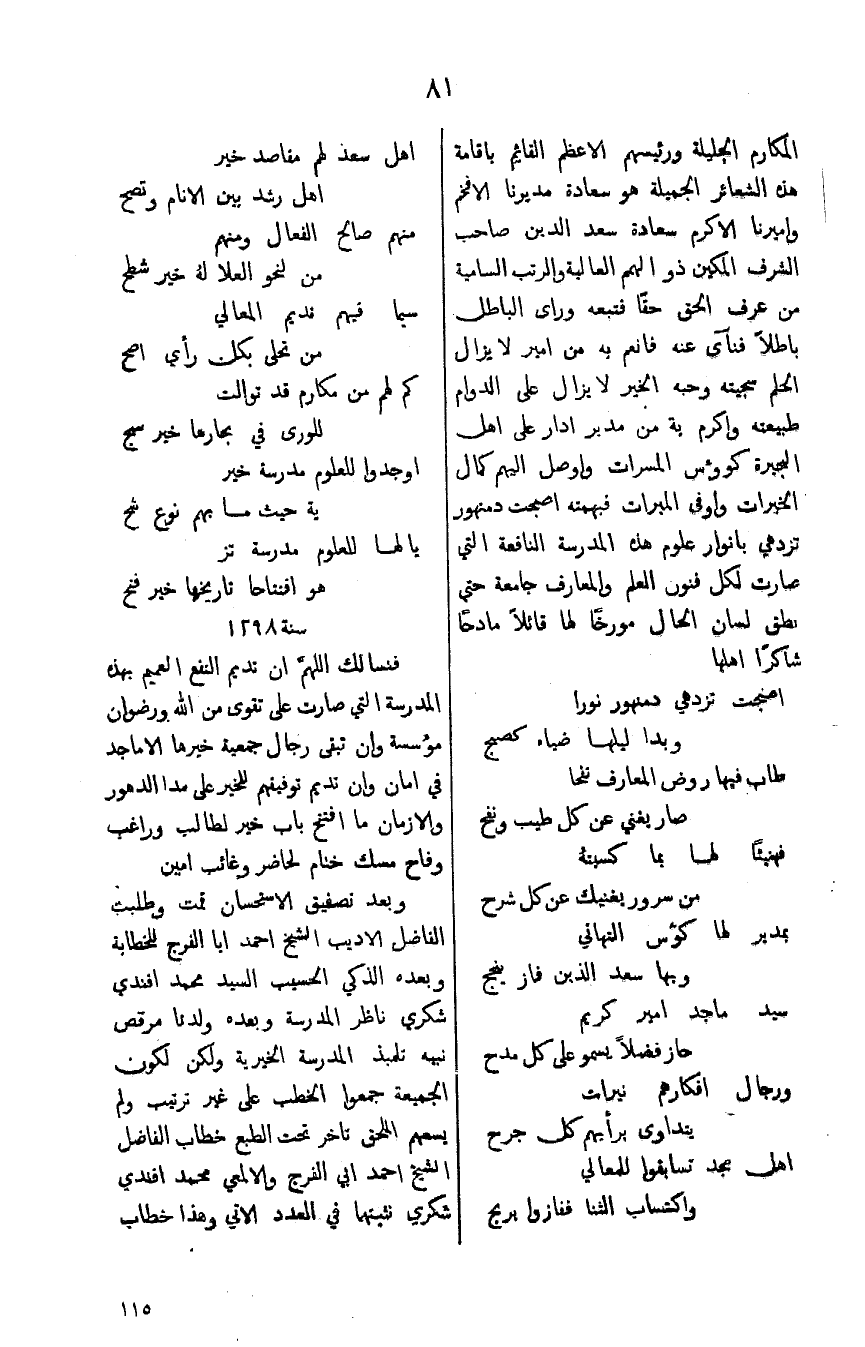 المكارم الجليلة ورئيسهم الاعظم القائم باقامة هذه الشعائر الجميلة هو سعادة مديرنا الافخم واميرنا الاكرم ذوا لهم العالية والرتب السامية من عرف الحق حقاً فتبعه وراى الباطل باطلاً فنآى عنه فانعم به من امير لا يزال الحلم سجيته وحبه الخير لايزال على الدوام طبيعته واكرم به من مدير ادار على اهل البحيرة كوؤس المسرات واوصل اليهم كمال الخيرات واوفى المبرات فبهمته اصبحت دمنهور تزدهي بانوار علوم هذه المدرسة النافعة التي صارت لكل فنون العلم والمعارف جامعة حتي نطق لسان الحال مورخاً لها قائلاً مادحاً شاكراً اهلها