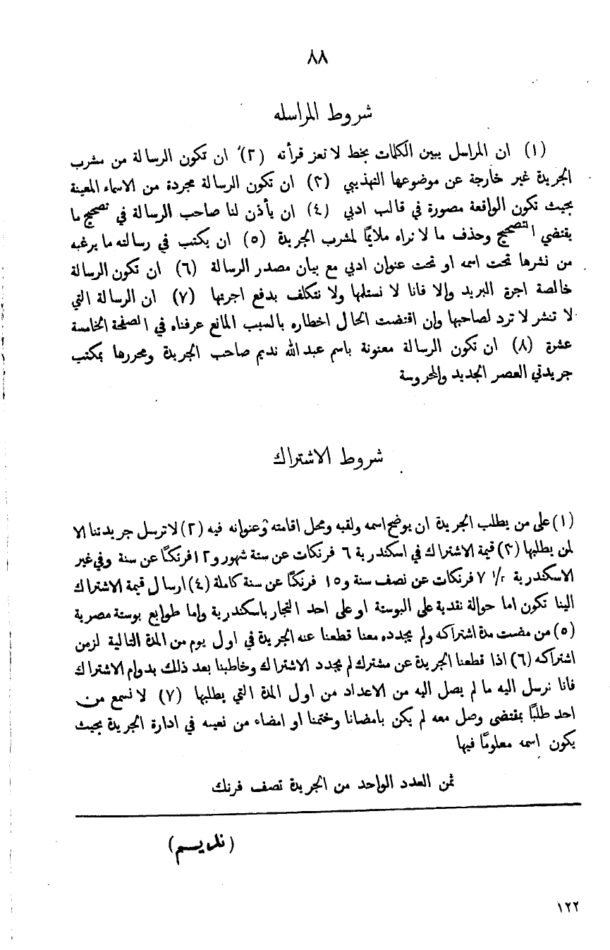 (1) ان المراسل يبين الكلمات بخط لاتعز قرأته (2) ان تكون الرسالة من مشرب الجريدة غير خارجة عن موضوعها التهذيبي (3) ان تكون الرسالة مجردة من الاسماء المعينة بحيث تكون الواقعة مصورة في قالب ادبي (4) ان يأذن لنا صاحب الرسالة في تصحيح ما يقتضي التصحيح وحذف ما لانراه ملايماً لمشرب الجريدة (5) ان يكتب في رسالتة مايرغبه من نشرها تحت اسمه او تحت عنوان ادبي مع بيان مصدر الرسالة (6) ان تكون الرسالة خالصة اجرة البريد والا فانا لا نستلمها ولا نتكلف بدفع اجرتها (7) ان الرسالة التي لاتنشر لاترد لصاحبها وان اقتضت الحال اخطاره بالسبب المانع عرفناه في الصحيفة الخامسة عشرة (8) ان تكون الرسالة معنونة باسم عبد الله نديم صاحب الجريدة ومحررها بمكتب جريدتي العصر الجديد والمحروسة