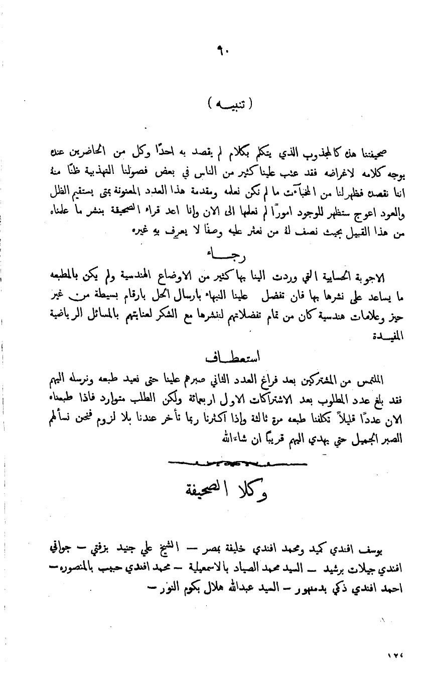 الاجوبة الحسابية التي وردت الينا بها كثير من الاوضاع الهندسية ولم يكن بالمطبعة مايساعد على نشرها بها فان تفضل علينا النبهاء بارسال الحل بارقام بسيطة من غير حيز وعلامات هندسية كان من تمام تفضلاتهم لنشرها مع الشكر لعنايتهم بالمسائل الرياضية المفيدة