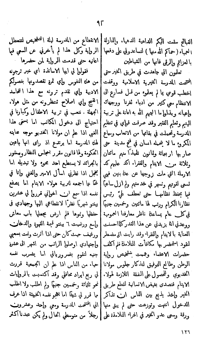اما يخجل اذا نظرني اسأ ل الامير والغني وان في غناً عما اجمعه لتربية هولاء الايتام اما يصفع نفسه اذا سمع ان اخواني قرروا لي عشرين بيلتو شهرياً نظراً لانقطاعي اليها وجهادي في حفظها ونموها فلم ارض بجعلها باب معاش واسع ورضيت 6 بينتو قيمة القهوة والدخان ورغيف حيث كان حتى اذا اثرت ونمت بسعيي واجتهادي اوصلوا الراتب من اشهر الى عشرة جنيه لتقوم بضرور ياتي اما يضرب نفسه حياء من الناس اذا علم ان الجمعية قررت لي ربع ايراد محافلي وقد اكتسبت بالروايات نحو ثلثمائة وخمسين جنيهاً ولم اطلب ولا اطلب مما قرر لي شيئاً اما يهجو نفسه الخبيثة اذا عرف اني افتتحت المدرسة ومعي واحد وعشرون رجلاً من متوسطي الحال ولم يكن عندنا اكثر