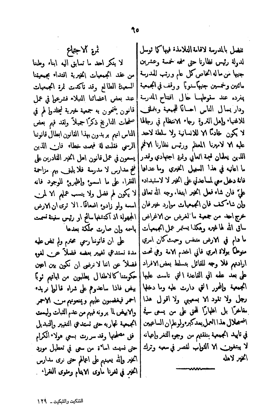 لا ينكر احد ما تسابق اليه ابناء وطننا من عقد الجمعيات الخيرية اقتداء بجمعيتنا السعيدة الطالع وقد تاكدت ثمرة الجمعيات عند بعض اعضائنا النبلاء فشرعوا في عمل قانون يفتحون به جمعية خيرية ليخلدوا لهم في صفحات التاريخ ذكراً جميلاً ولقد فهم بعض الناس انهم يريدون بهذا القانون ابطال قانوننا الرسمي فقلت لهُ فهمت خطاء فان الذين يسعون في عمل قانون اهل الخير القادمون على فتح ندارس لا مدرسة. فلا يليق بهم مزاحمة الفقراء على ما اسسوه واظهروه للوجود فانه لايكون لهم فضل ولاينسب عملهم الا لمن اسسه ولو زادوه اضعافاً. الا ترى ان الارض المجهولة اذ اكتشفها سائح او رئيس سفينة تسمت باسمه وان صارت مملكة بعدها