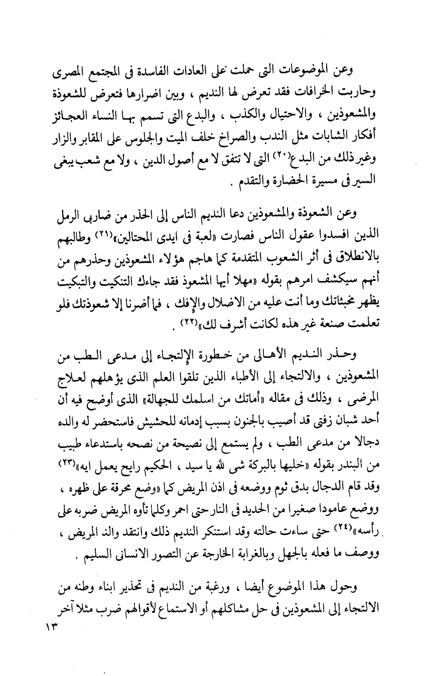 وعن الشعوذة والمشعوذين دعا النديم الناس إلى الحذر من ضاربي الرمل الذين أفسدوا عقول الناس فصارت "لعبة في أيدي المحتالين" (¬21) وطالبهم بالإنطلاق في أثر الشعوب المتقدمة كما هاجم هؤلاء المشعوذين وحذرهم من أنهم سيكشف أمرهم بقوله "مهلاً أيها المشعوذ فقد جاءك التنكيت والتبكيت يظهر مخبئاتك وما أنت عليه من الإضلال والإفك، فما أضرنا إلا شعوذتك فلو تعلمت صنعة غير هذه لكانت أشرف لك" (¬22).