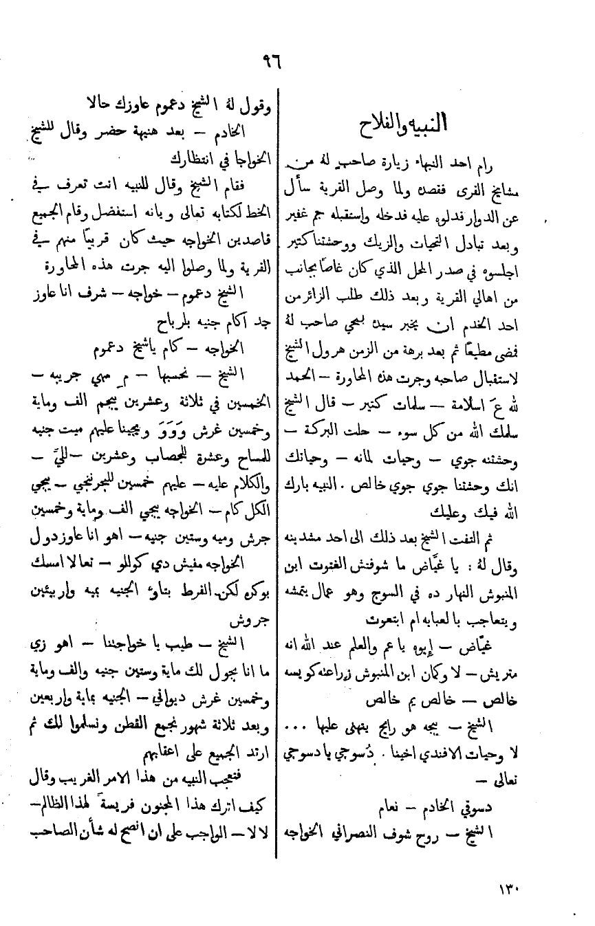 رام احد النبهاء زيارة صاحب لهُ من مشايخ القرى فقصده ولما وصل القرية سأل عن الدوار فداوه عليه فدخله واستقبله جم غفير وبعد تبادل التحيات والزيك ووحشتنا كتير اجلسوه في صدر المحل لذي كان غصاً بجانب من اهلي القرية وبعد ذلك طلب الزائر من احد الخدم ان يخبر سيده بمحي صاحب لهُ فمضى مطيعاً ثم بعد برهة من الزمن هرول الشيخ لاستقبال صاحبه وجرت هذه المحاورة - الحمد لله عَ اسلامه - سلمات كتير - قال الشيخ سلمك اله من كل سوء - حلت لمانه - وحياتك انك وحشتنا جوي جوي خالص. النبيه بارك الله فيك وعليك