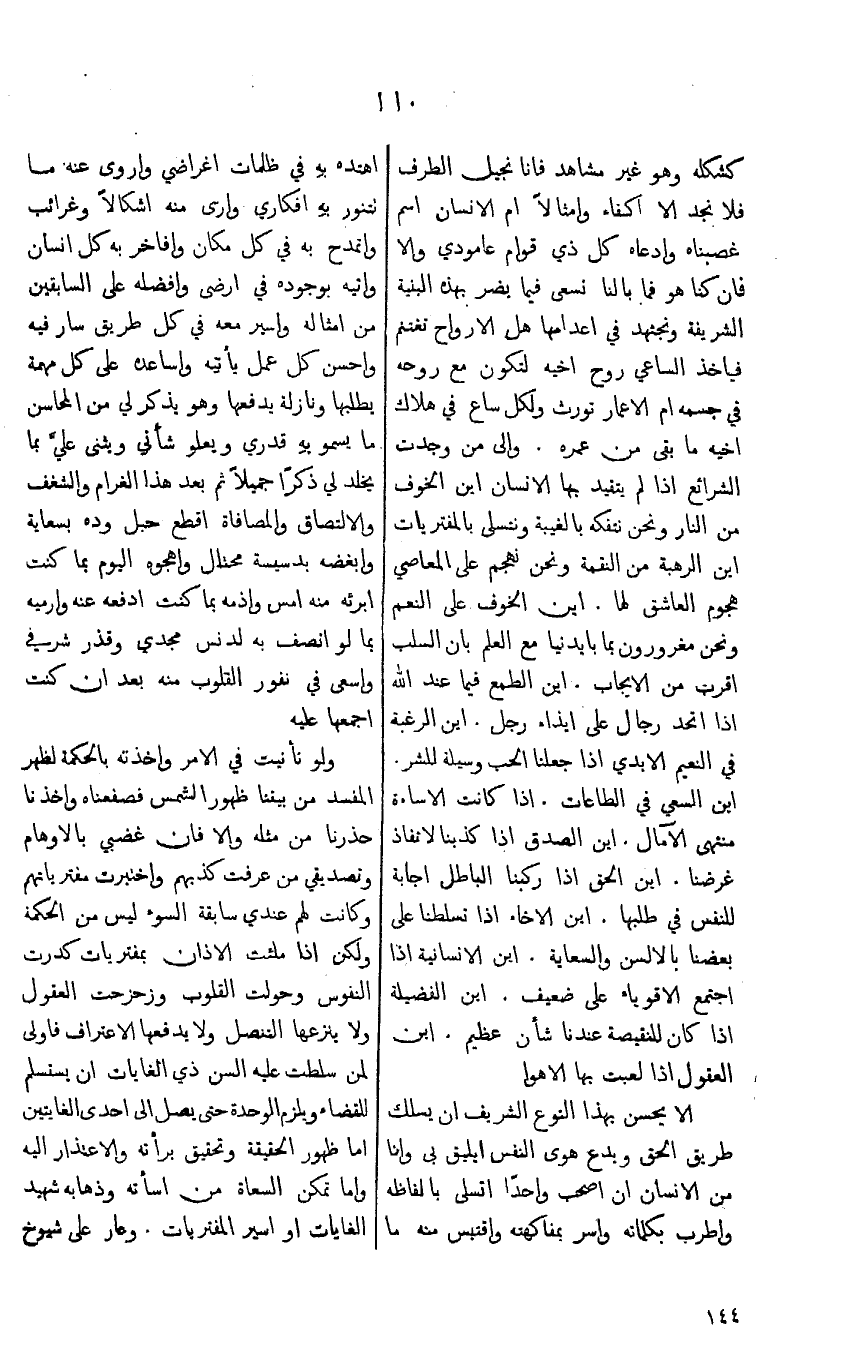 كشكله وهو غير مشاهد فانا نجيل الطرف فلا نجد الا اكفاء وامثالاً ام الانسان اسم غصبناه وادعاه كل ذي قوام عامودي والا بان كنا هو فما بالنا نسعى فيما يضر بهذه البنية الشريفة ونجتهد في اعدامها هل الارواح تغتنم فياخذ الساعي روح اخيه لتكون مع روحه في جسمه ام الاعمار تورث ولكل ساع في هلاك اخيه ما بقى من عمره. والى من وجدت الشرائع اذا لم يتقيد بها الانسان اين الخوف من النار ونحن نتفكه بالغيبة ونتسلى بالمفتريات بن الرهبة من النقمة ونحن نهجم على المعاصي هجوم العاشق لها. اين الخوف على النعم ونحن مغرورون بما بايدينا مع العلم بان السلب اقرب من الايجاب. اين الطمع فيم عند الله اذا اتحد رجال على ايذاء رجل. اين الرغبة في النعيم الابدي اذا جعلنا الحب وسيلة للشر. اين السعي في الطاعات. اذا كانت الاساءة منتهى الآمال. اين الصدق اذا كذبنا لانفاذ غرضنا. اين الحق اذا ركبنا البطل اجابة للنفس في طلبها. اين الانسانية اذا اجتمع الاقوياء على الضعيف. اين الفضيلة اذا كان للنقيصة عندنا شأن عظيم. اين العقول اذا لعبت بها الاهواء
