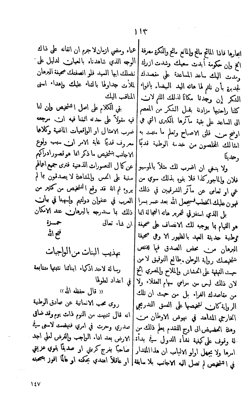 ولا ينبغي ان اضرب لك مثلاً بالموسيو فلان والماجور كذا فلا يفوه بذلك سوي من عمي او تعامى من مآثر الشرقيين في ذلك فهوّن عليك الخطب فسيجعل الله بعد عسر يسرا بل الذي استفزني لتحرير هاته العجالة انما هوالقيام بما يوجبه لك الانصاف على صحيفة وطنية حديثة العهد بالظهور الا وهي صحيفة البرهان من محض الصدق فيما يختص بتشخيصك رواية الوطن وطالع التوفيق لا من حيث القهقهة على الحشاش والملاح والمصري الخ لان ذلك ليس من مرامي سهام العقلاء ولا من مقاصدك الغراء بل من حيث ان تلك الرواية كان تشخيصها على النسق التدريجي الخارجي المشاهد في نهوض الاوطان من وهدة الحضيض الى اوج التقدم بعلم ذلك من لهُ وقوف على كيفية نشاة الدول في بدأة امرها ولا يجهل اولو الالباب ان هذا المقدار في التشخيص لم تصل اليه الاجانب بلا سابقة