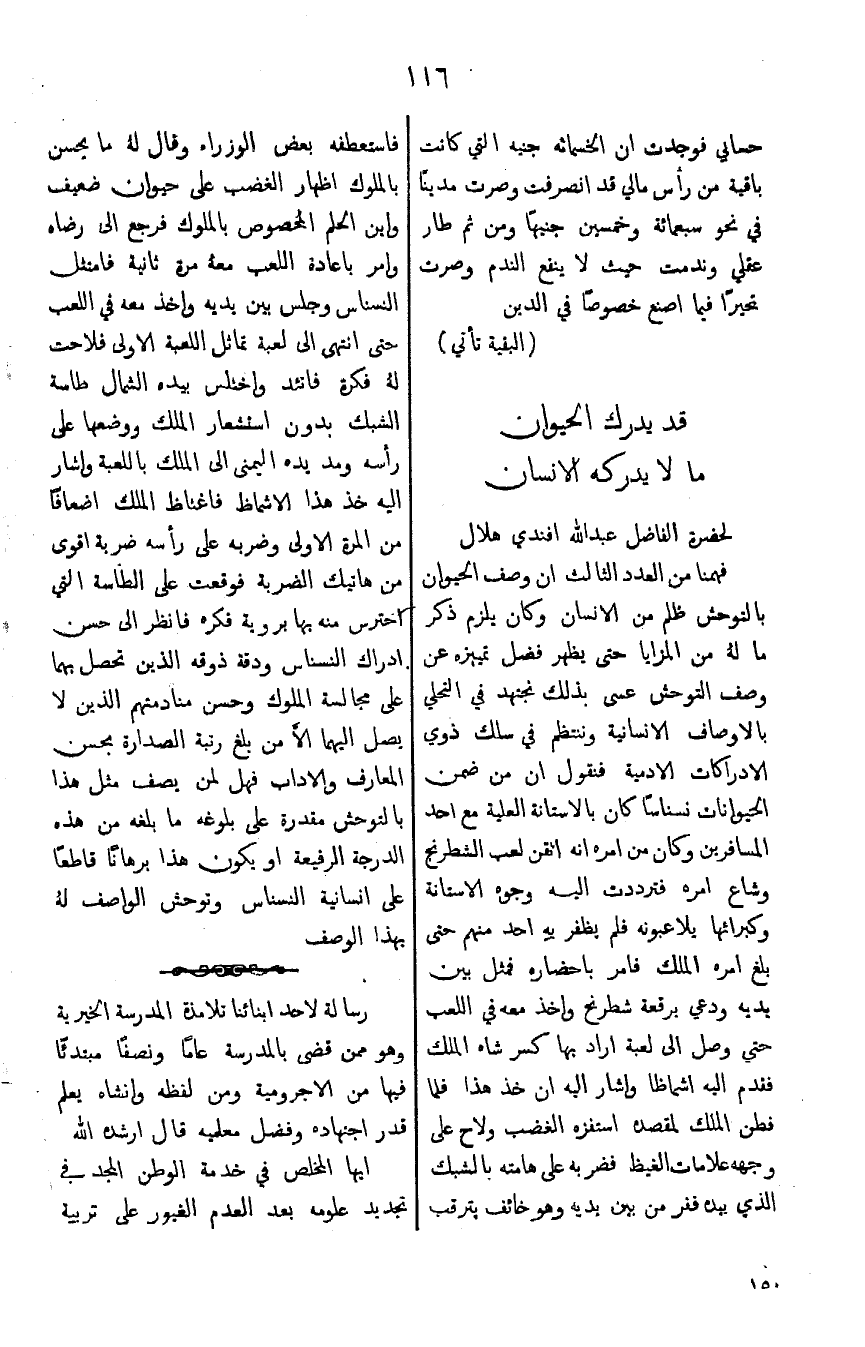 لحضرة الفاضل عبد الله افندي هلال فهمنا من العدد الثالث ان وصف الحيوان بالتوحش ظلم من الانسان وكان يلزم ذكر ما لهُ من المزايا حتى يظهر فضل تمييزه عن وصف التوحش عسى بذلك نجتهد في التحلي بالاوصاف الانسانية وننتظم في سلك ذوي الادراكات الادمية فنقول ان من ضمن الحيوانات نسناساً كان بالاستانة العلية مع احد المسافرين وكان من امره انه اتقن لعب الشطرنج وشاع امره فترددت اليه وجوه الاستانة وكبرائها يلاعبونه فلم يظفر به احد منهم حتى بلغ امره الملك فامر باحضاره فمثل بين يديه ودعي برقعة شطرنج واخذ معه في اللعب حتى وصل الى لعبة اراد بها كسر شاه الملك فقدم اليه اشماظا واشار اليه ان خذ هذا فلما فطن الملك لمقصده استفزه الغضب ولاح على وجهه علامات الغيظ فضربه على هامته بالشبك الذي بيده ففر من بين يديه وهو خائف يترقب فاستعطفه بعض الوزراء وقال لهُ مايحسن بالملوك اظهار الغضب على حيوان ضعيف واين الحلم المخصوص بالملوك فرجع الى رضاء وامر باعادة اللعب معهُ من ثانية فامتثل النسناس وجلس بين لعبة تماثل اللعبة الاولى فلاحت لهُ فكرة فائد واختلس بيده الشمال طاسة الشبك بدون استشعار الملك ووضعها على رأسه ومد يده اليمنى الى الملك باللعبة واشار اليه خذ هذا الاشماظ فاغتاظ الملك اضعافاً من المرة الاولى وضربه على رأسه ضربة اقوى من هاتيك الضربة فوقعت على الطاسة التي احترس منه بها بروية فكرة فانظر الى حسن ادراك النسناس ودقة ذوقه الذين تحصل بهما على مجالسة الملوك وحسن منادمتهم الذين لا يصل اليهما الاّ من بلغ ربة الصدارة بحسن المعارف والاداب فهل لمن يصف مثل هذا بالتوحش مقدرة على بلوغه ما بلغه من هذه الدرجة الرفيعة او يكون هذا برهاناً قاطعاً على انسانية النسناس وتوحش الواصف لهُ بهذا الوصف