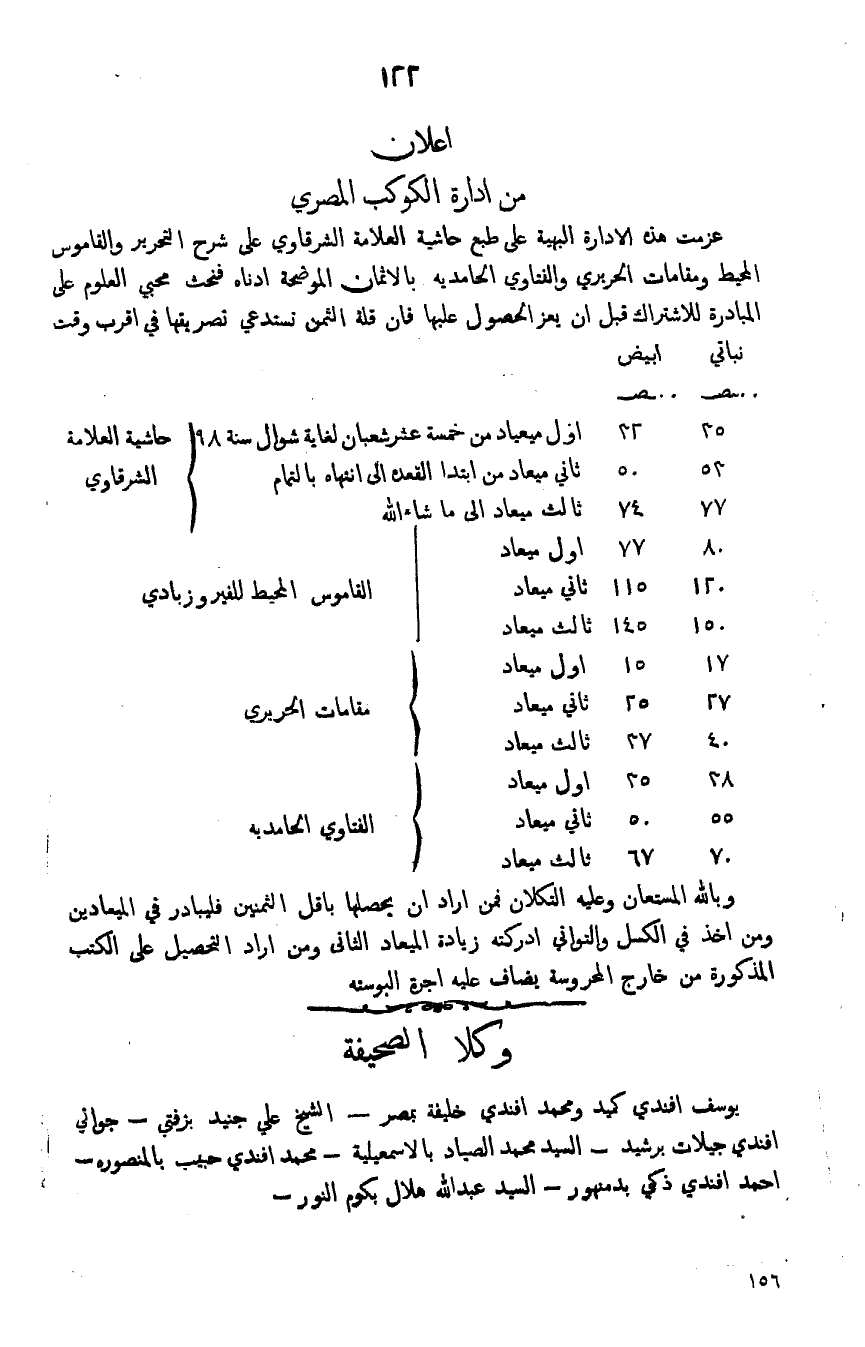 عزمت هذه الادارة البهية على طبع حاشية العلامة الشرقاوي على شرح التحرير والقاموس المحيط ومقامات الحريري والفتاوي الحامديه بالاثمان الومضحة ادناه فنحث محبي العلوم على المبادرة للاشتراك قبل ان يعز الحصول عليها فان قلة الثمن تستدعي تصريفها في اقرب وقت