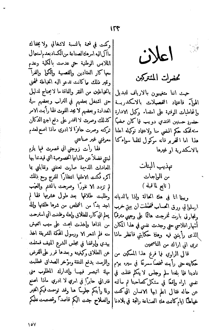 قال الراوي فما فرغ هذا المسكين من حكايته حتى رأيت شخصاً مسرعاً في سيره يؤم نادينا فلما بلغنا سلم وجلس لايتكلم فقلت في نفسي اراه واقعاً في مشكل كصاحبنا ثم سالته عن حاله فقال اعلم ايها الانسان اني كنت خياطاًً ايام كانت هذه الصناعة رائجة في بلادها وكنت في نعمة بالنسبة لاشغالي ولا يخفاك مآل اليه امر هذه الصناعة من الكساد بعدم استعمال الملابس الوطنية حتى عدمت بالكلية وعدم معها كار العقادين والقصيبة والكوا والفرا وغير ذلك مما كانت تدعو اليه الخياطة فلحق بالخياطين من الفقر والفاقة مالايحتاج لدليل حتى اشتغل بعضهم في التراب وبعضهم في الحدادة وبعضهم لايجد القوت فلما رأيت الامر كذلك وصرت لااقدر على دفع اجرة الدكان تركته وصرت حائراً لاادري ماذا اصنع لعدم معرفتي غير صناعتي