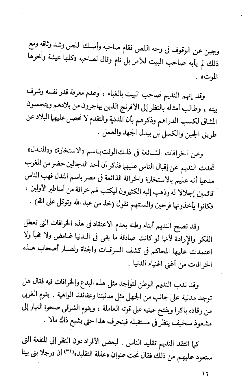 وقد ندب النديم الوطن لتواجد مثل هذه البدع والخرافات فيه فقال هل توجد مدنية على جانب من الجهل مثل مدنيتنا وعقائدنا الواهية. يقوم الغربي من رقاده باكرًا ويفتح عينيه على قوته العاملة، ويقوم الشرقي صحوة النهار إلى مشعوذ سخيف ينظر في مستقبله فينحرف هذا حتى يشبع ذاك مالاً.