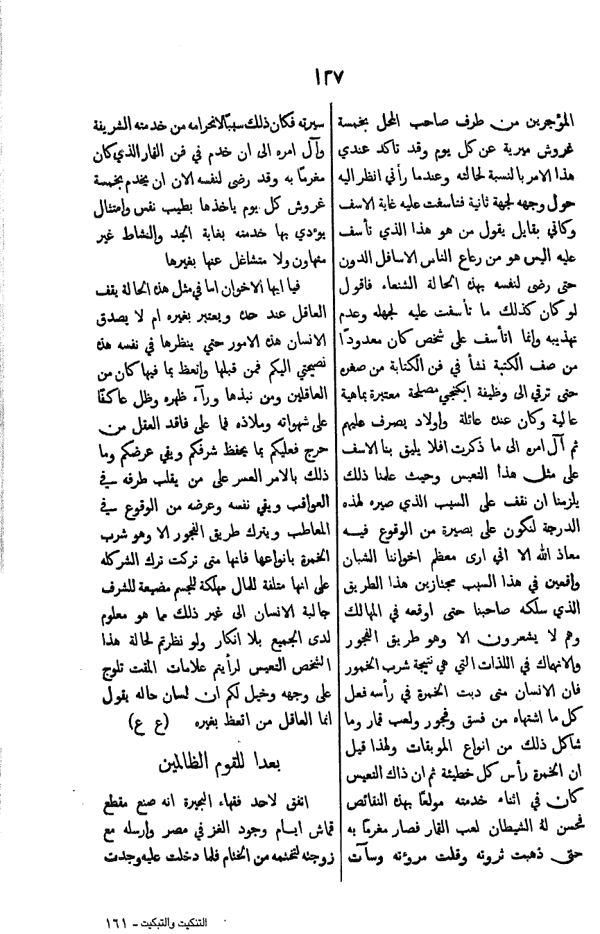 المؤجرين من طرف صاحب المحل بخمسة غروش ميرية عن كل يوم وقد تاكد عندي هذا الامر بالنسبة لحالته وعندما رأني انظر اليه حول وجهه لجهة ثانية فتاسفت عليه غاية الاسف وكاني بقايل يقول من هو الذي تأسف عليه اليس هو من رعاع الناس الاسافل الدون حتى رضى لنفسه بهذه الحالة الشنعاء فاقول لو كان كذلك ما تأسفت عليه لجهله وعدم تهذيبه وانما اتأسف على شخص كان معدوداً من صف الكتبة نشأ في فن الكتابة من صغره حتى ترقي الى وظيفة ايكنجي مصلحة معتبرة بماهية عالية وكان عنده عائلة واولاد يصرف عليهم ثم آل امره الى ما ذكرت افلا يليق بنا الاسف على مثل هذا التعيس وحيث علمنا ذلك يلزمنا ان نقف على السبب الذي صيره لهذه الدرجة لنكون على بصيرة من