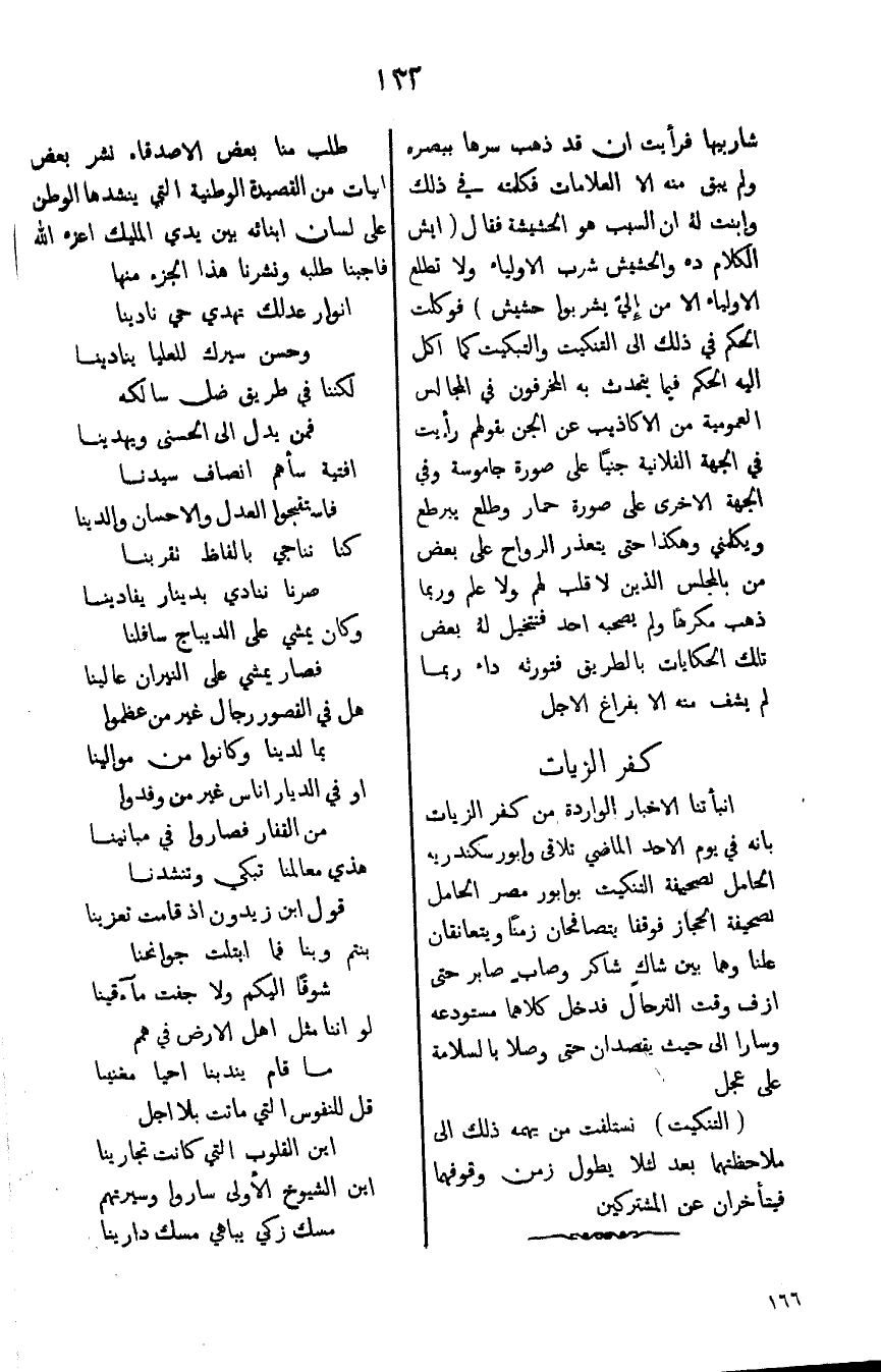 انبأئنا الاخبار الواردة من كفر الزيات بانه في يوم الاحد الماضي تلاقي وابور سكندريه الحامل لصحيفة التنكيت بوابور مصر الحامل لصحيفة الحجاز فوقفنا يتصافحان زماً ويتعانقان علنا وهما بين شاكٍ شاكر وصابِ صابر حتى ازف وقت الترحال فدخل كلاهما مستودعه وسارا الى حيث يقصدان حتى وصلا بالسلامة على عجل