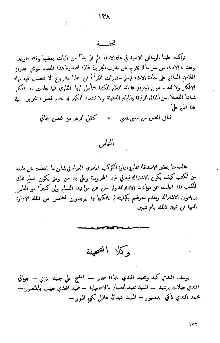 تراكمت علينا الرسائل الادبية في هذه الاثناء فلم نرَ بداً من اثبات بعضها وفاء بما وعدنا ونعد به الادباء من نشر مالا يخرج من مشرب الجريدة فلذا اصدرنا هذا العدد موشي بطراز اقلامهم السائرة على جادة الاخاء ليعلم حضرات القرآء ان هذا مشروع لاتنضب فيه مياه الافكار ولاتقف دون اجتياز عقابه اقلام الكتبة فتأمل ايها القاري فيما جادت به افكار شبابنا الفضلاء من المعاني الرقيقة والمباني الدقيقة ولا تشدد النكير في عدم قصر التحرير في هذه المرة عليّ