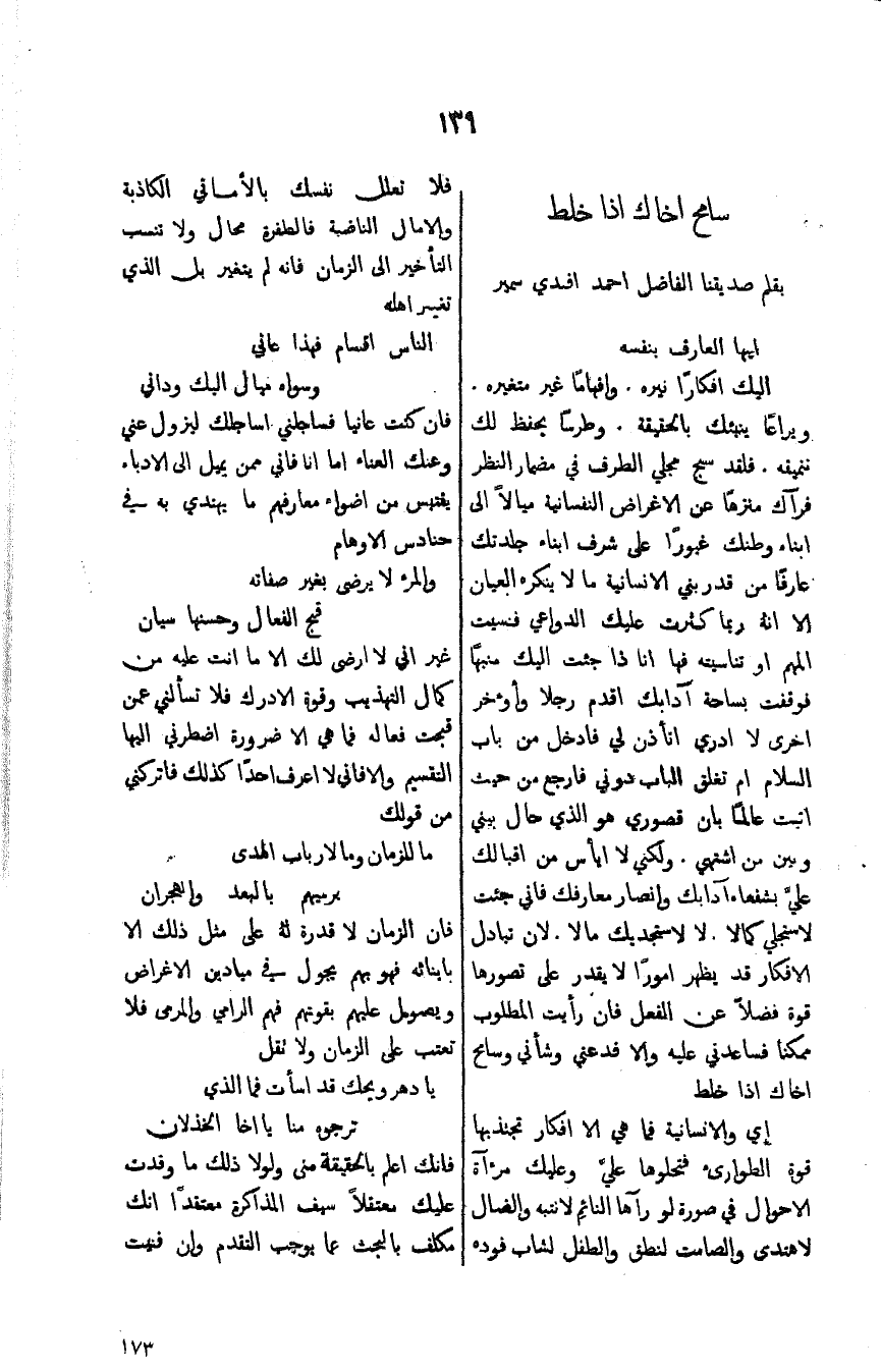 اليك افكاراً يره. وافهاماً غير متغيره. ويراعاً ينبئك بالحقيقة. وطرساً يحفظ لك ننميقه. فلقد سج مجلي الطرف في مضمار النظر فرآك منزهاً عن الاغراض النفسانية ميالاً الى ابناء وطنك غيوراً على شرف ابناء جلدتك عارفاً من قدربني الانسانية مالاينكره العيان الا انهُ ربما كثرت عليك الدواعي فنسيت المهم او تناسيته فها انا ذا جئت اليك منبهاً فرقفت بساحة آدابك اقدم رجلا وأؤخر اخرى لاادري اتأذن لي فادخل من باب السلام ام تغلق الباب دوني فارجع من حيث شئت عالماً بان قصوري هو الذي حال بيني وبين من اشتهي. ولكن لا اياس من اقبالك علي بشفعاء آدابك وانصار معارفك فاني جئت لاستجلي كمالا. لا لاستجديك مالا. ن تبادل الافكار قد يظهر اموراً لايقدر على تصورها قوة فضلاً عن الفعل فان رأيت المطلوب ممكنا فساعدني عليه والا فدعني وشأني وسامح اخاك اذا خلط