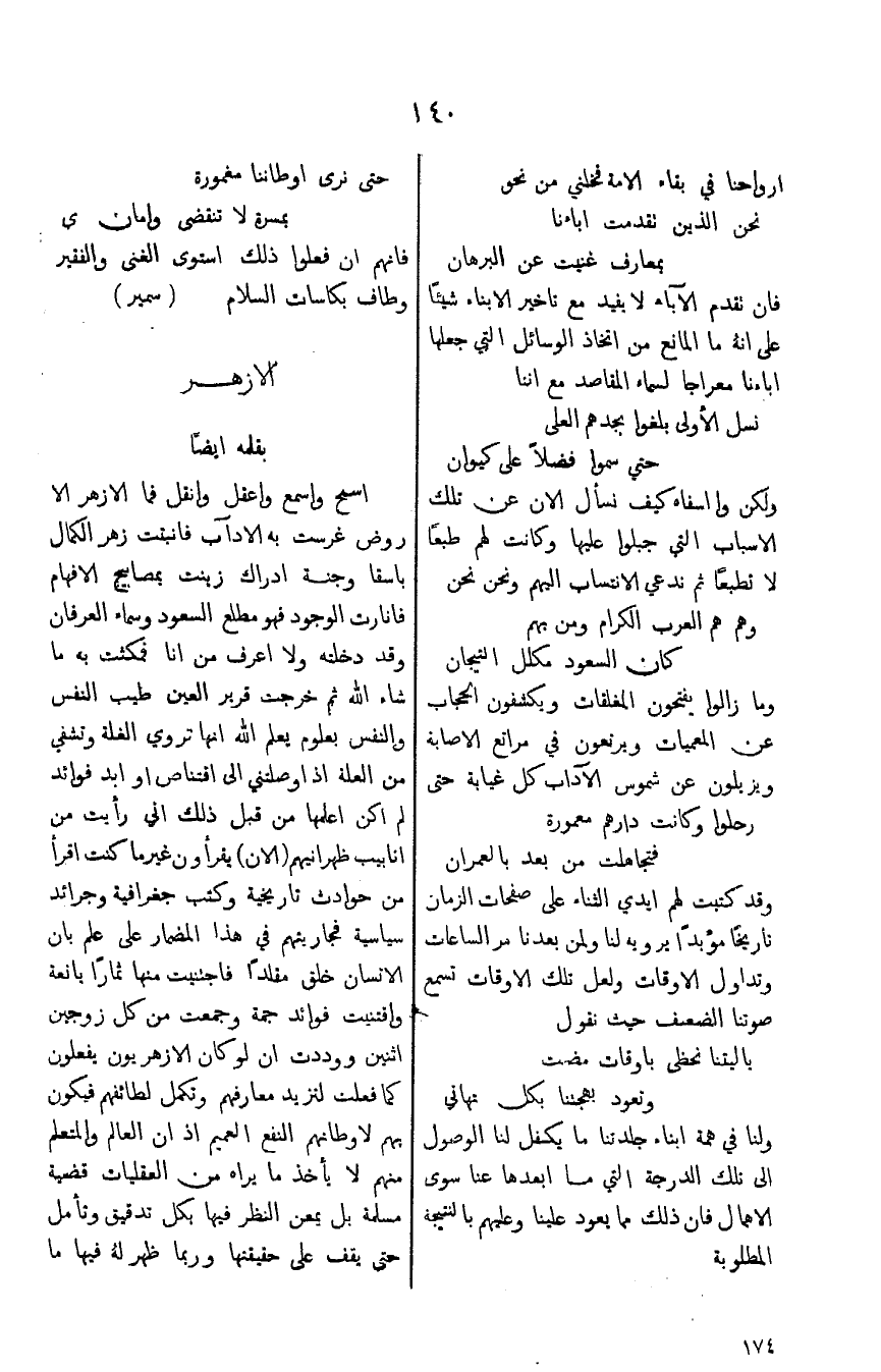 اسمح واسمع واعقل وانقل فما الازهر الا روض غرست به الآداب فانبتت زهر الكمال باسقا وجنة ادراك زينت بمصابيح الافهام فانارت الوجود فهو مطلع السعود وسماء العرفان وقد دخلته ولا اعرف من انا فمكثت به ما شاء الله ثم خرجت قرير العين طيب النفس والنفس بعلوم يعلم الله انها تروي الغلة وتشفي من العلة اذا وصلتني الى اقتناص او ابد فوائد لم اكن اعلمها من قبل ذلك اني رايت من انابيب ظهر انيهم (الان) يقرأون غيرما كنت اقرأ من حوداث تاريخية وكتب جغرافية وجرائد سياسية فجاريتهم في هذا المضمار على علم بان الانسان خلق مقلداً فاجتنيت منها ثماراً بانعة واقتنيت فوائد جمة وجمعت من كل زوجين اثنين ووددت ان لو كان الازهريون يفعلون كما فعلت لتزيد معارفهم وتكمل لطائفهم فيكون بهم لاوطانهم النفع العميم اذ ان العالم والمتعلم منهم لا يأخذ ما يراه من العقليات قضية مسلمة بل يمهن لنظر فيها بكل تدقيق وتأمل حتى يقف على حقيقتها وربما ظهر لهً فيها ما