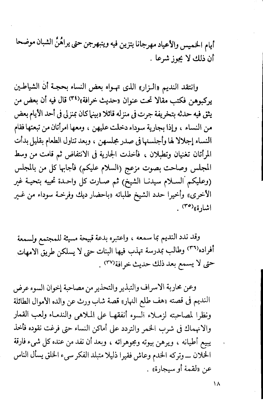 وقد ندد النديم بما سمعه، واعتبره بدعة قبيحة مسيئة للمجتمع ولسمعة أفراده (¬36) وطالب بمدرسة تهذب فيها البنات حتى لا يسلكن طريق الأمهات حتى لا يسمع بعد ذلك حديث خرافة (¬37).