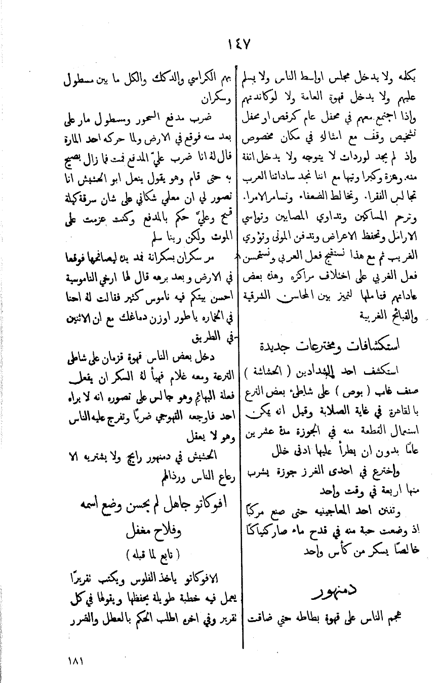 يكلمه ولا يدخل مجلس اواسط الناس ولا يسلم عليهم ولا يدخل قهوة العامة لو كاندتهم واذا اجتمع معهم في محفل عام كرقص او محفل تشخيص وقف مع امثاله في مكان مخصوص واذا لم يجد لوردات لايتوجه ولا يدخل انفة منه وعزة وكبراوتيها مع اننا نجد ساداتنا العرب تجالس الفقراء وتخالط الضعفاء وتسامر الامراء وترحم المساكين وتداوي المصابين وتواسي الارامل وتحفظ الاعراض وتدفن الموتى وتؤوي الغريب ثم مع هذا نستقج فعل العربي ونستحسن فعل الغربي على اختلاف مراكزه وهذه بعض عاداتهم فتاملها لتميز بين المحاسن الشرقية والقبائح الغربية