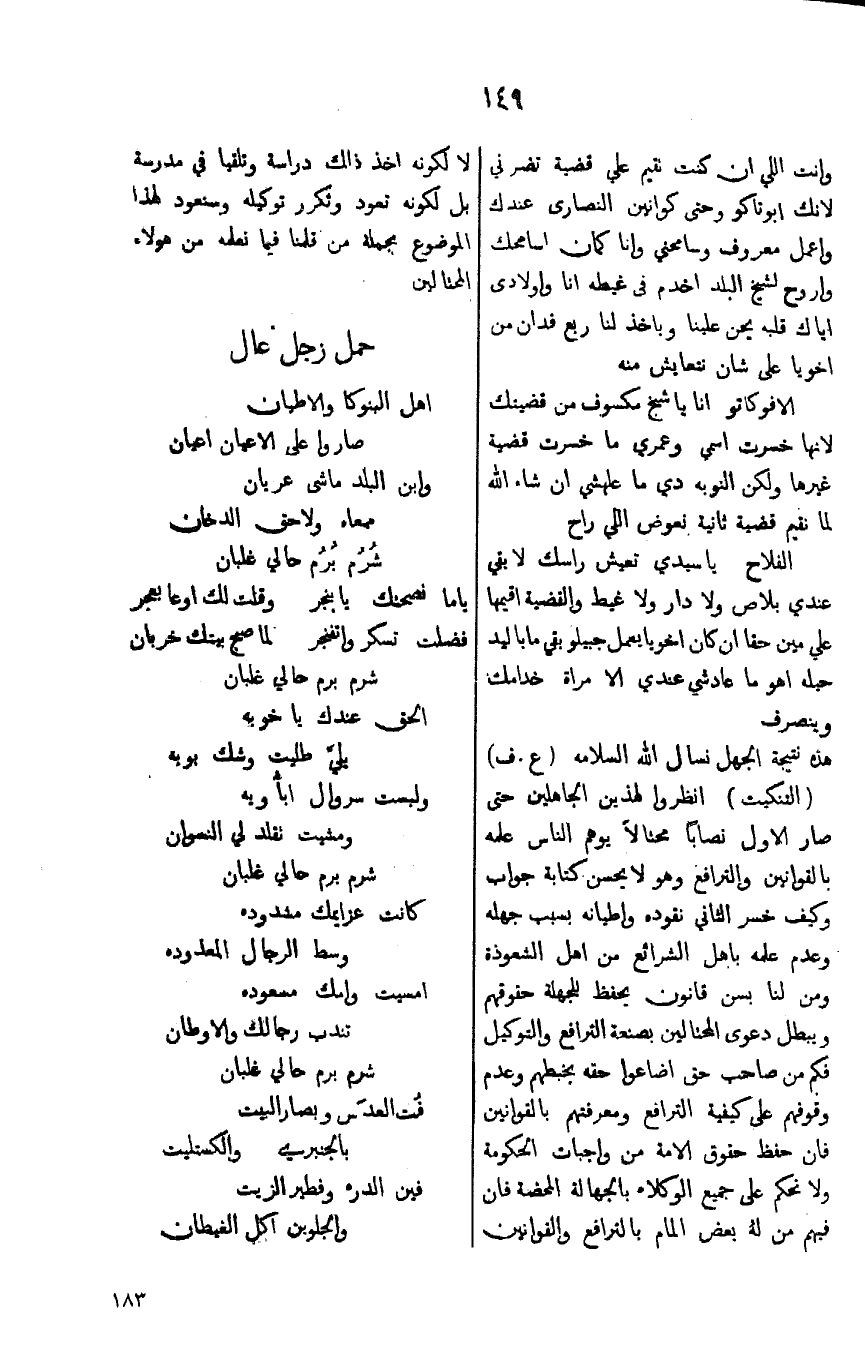 (التنكيت) انظروا لهذين الجاهلين حتى صار الاول نصاباً محتالاً يوهم الناس علمه بالقوانين والترافع وهو لايحسن كتابة جواب وكيف خسر الثاني نقوده واطيانه بسبب جهله وعدم علمه باهل الشرائع من اهل الشعوذة ومن لنا بسن قانون يحفظ للجهلة حقوقهم ويبطل دعوى المحتالين بصنعة الترافع والتوكيل فكم من صاحب حق اضاعوا حقه بخطبهم وعدم وقوفهم على كيفية الترافع ومعرفتهم بالقوانين فان حفظ حقوق الامة من واجبات الحكومة ولا نحكم على جميع الوكلاء بالجهالة المحضة فان فيهم من لهُ بعض المام بالترافع والقوانين لالكونه اخذ ذلك دراسة وتلقيا في مدرسة بل لكونه تهود وتكرر