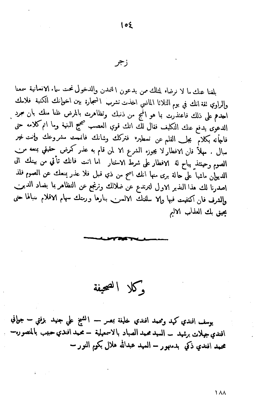 بلغنا عنك ما لانرضاه لمثلك ممن يدعون التمدن والدخول تحت سماء الانسانية سمعنا والراوي ثقة انك في يوم الثلاثا اماضي اخذت تشرب السجارة بين اخوانك الكتبة فلامك احدهم على ذلك فاعتذرت بما هو اقبح من ذنبك وتظاهرت بالمرض ظنا منك بان مجرد الدعوى يدفع عنك التكليف فقال لك انك قوي العصب صحيح البنية وما اتم كلامه حتى فاجاته بكلام يجل القلم عن تسيره فتركك وشانك فاتممت مشروعك وانت غير ميال. مهلاً فان الافطار لايجوزه الشرع الا لمن قام به عذر كمرض حقيقي يمنعه من الصوم وحينئذ يباح لهُ يرى منها انك اصح من ذي قبل فلا عذر يمنعك عن الصوم فلذا اصدرنا لك هذا النذير الاول لترتدع عن ضلالك وترتجع عن التظاهر بما يضاد الدين والشرف فان اكتفيت فيها والا سلقتك الالسن بنارها ورمتك سهام الاقلام بنبالها حتى يحيق بك العذاب الاليم
