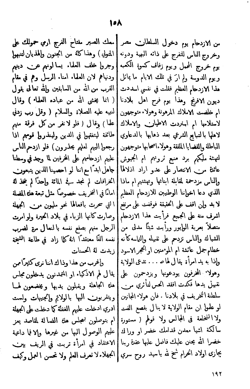 من الازدحام يوم دخول السلطان مصر وخروج الناس للتفرج على ذاته البهية ودونه يوم خروج المحمل ويوم زفاف كسوة الكعبه ويوم الدوسة ولم ارَ في تلك الايام ما يماثل هذا الازدحام العظيم فقلت في نفسي اسددت ديون الافرنج وهذا يوم فرح اهل بلادنا ام خلصت الاملاك المرهونة وهولاء متوجهون لاستلامها ام استردت الاطيان والاملاك لاهلها بالتبابع الشرعي بعد ذهابها بالدعاوي الباطلة والقضايا الملفقة وهولاء اصحابها متوجهون لتهنئة مليكهم برد منبع ثروتهم ام الجيوش عائدة من الانتصار على عدو اراد اذلالها والناس مزدحمة لمقابلة ابنائها وتهئنهم ام ماذا الذي دعا اخواننا الوطنيين للازدحام العظيم لابد وان اقف على الحقيقة فوقفت على مرتفع اشرف منه على الجميع فرأيت هذا الازدحام متصلاً بعربة الوابور ورأيت شيئاً مدلى من الشباك والناس تزدحم على تقبيله والتماسه كأنه خطام جمل عائشة ام المؤمنين او الحجر الاسود واذا به يد امراة يقال لها ص. . . تدعى الولاية وهولاء المخرفون يودعونها ويزدحمون على تقبيل يدها فكدت افقد الحس لتأثري من سلطنة التخريف في بلادنا. فان هولاء المجانين لو علموا ان مقام الولاية لا ينال بقصع الفت ولا الشخلعة في المجالس ولا قولهم (مستورة سالكة اشيا معدن قدامك خضر او وراك خضرا الله يحنن عليك فاضل عليها عدة ربنا يجازى اولاد الحرام شيخ لله ياسيد روح سري معك الصبر مفتاح الفرج ارمي حمولك على المتولي) وهذا كلهُ من الجنون والهذيان لتنبهوا وجروا خلف العلماء يسالونهم عن دينهم ودنياهم لان العلماء امنا الرسل وهم في