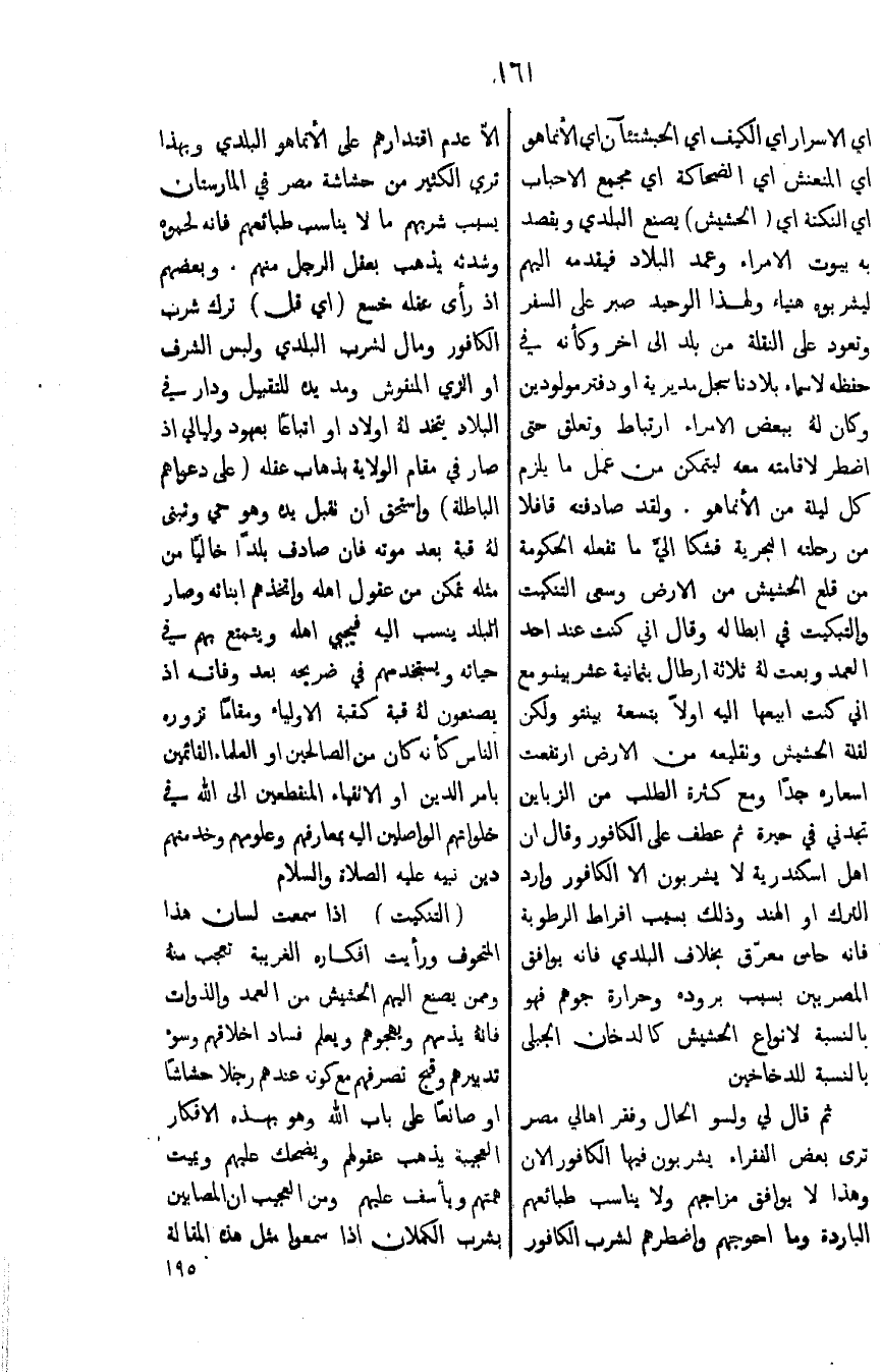ثم قال لي ولسؤ الحال وفقر اهالي مصر ترى بعض الفقراء يشربون فيها الكافور الان وهذا لايوافق مزاجهم ولا يناسب طبائعهم الباردة وما احوجهم واظطرهم لشرب الكافور الاّ عدم اقتدارهم على الأنماهو البلدي وبهذا ترى الكثير من حشاشة مصر في المارستان بسبب شربهم ما لايناسب طبائعهم فانه لحموه وشدته يذهب بعقل الرجل منهم. وبعضهم اذ رأى عقله خسع (أي اقل) ترك شرب الكافور ومال لشرب البلدي ولبس الشرف او الزي