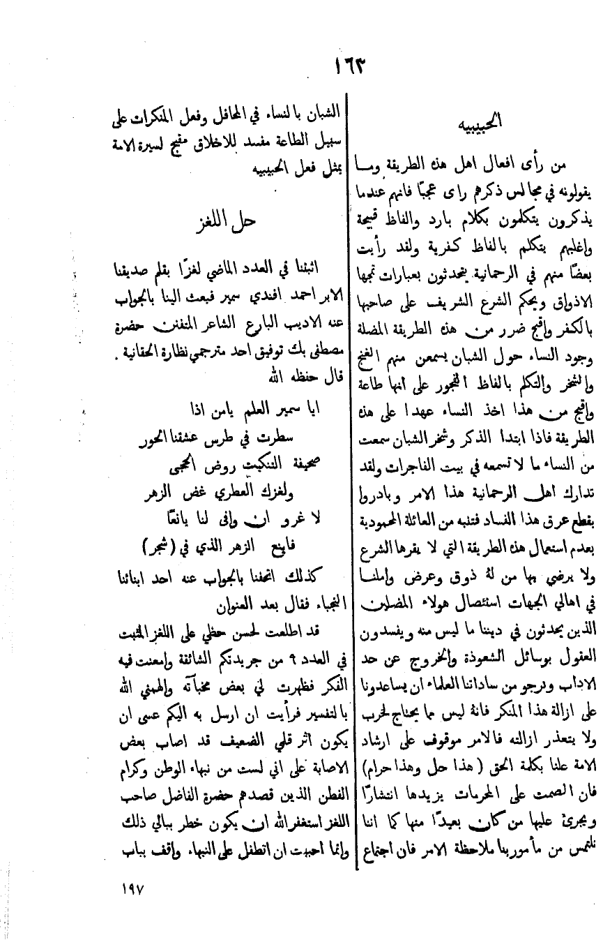 قد اطلعت لحسن حظي على اللغز المثبت في العدد 9 من جريدتكم الشائقة وامنعت فيه الفكر فظهرت لي بعض مخبآته والهمني الله بالتفسير فرأيت ان ارسل به اليكم عسى ان يكون اثر قلمي الضعيف قد اصاب بعض الاصابة على اني لست من نبهاء الوطن وكرام الفطن الذين قصدهم حضرة الفاضل صاحب اللغز استغفر الله ان يكون خطر ببالي ذلك وانما احببت ان اتطفل على النبهاء واقف بباب