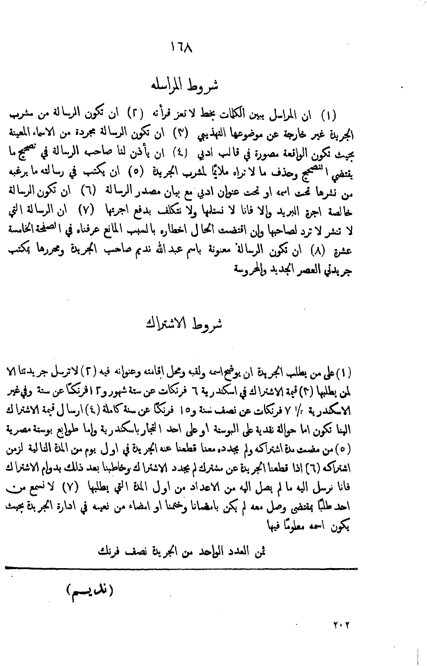 (1) على من يطلب الجريدة ان يوضح اسمه ولقبه ومحل اقامته وعنوانه فيه (2) لاترسل جريدتنا الا لمن يطلبها (3) قيمة الاشتراك في اسكندرية 6 فرنكات عن ستة شهور 12 فرنكا عن سنة وفي غير الاسكندرية 2/ 1 7 فرنكات عن نصف سنة و15 فرنكاُ عن سنة كاملة (4) ارسال قيمة الاشتراك الينا تكون اما حوالة نقدية على البوستة او على احد التجار باسكندرية واما طوابع بوستة مصرية (5) من مضت مدة اشتراكه ولم يجدده معنا قطعنا عنه الجريدة في اول يوم من المدة التالية لزمن اشتراكه (6) اذا قطعنا الجريدة عن مشترك لم يجدد الاشتراك وخاطبنا بعد ذلك بدوام الاشتراك فانا نرسل اليه ما لم يصل اليه من الاعداد من اول المدة التي يطلبها (7) لانسمع احد طلباً بمقتضى وصل معه لم يكن بامضانا وختمنا او امضاه من نعيمه في ادارة الجريدة بحيث يكون اسمه معلوماً فيها