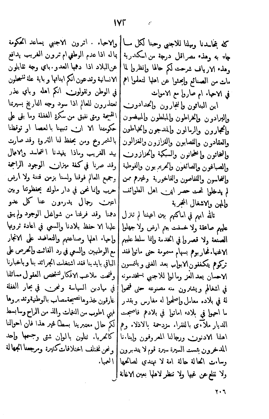 تالله انهم في اماكنهم بين اعيننا لم تنزل عليهم صاعقة ولا خسفت بهم ارض ولا جهلوا الصنعة ولا قصروا في الخدمة وانما سلط عليهم الاغنياء فحاربوهم بسهام مسمومة حتى ماتوا فقد تركوهم يتكففون الابواب بعد الغنى ويلتمسون الاحسان بعد العز ومالوا للاجنبي يستخدمونه في اشغالهم ويشترون منه مصنوعه حتى فتحوا لهُ في بلاده معامل واصلحوا له مغارس وبقدر ما احيوا في بلاده اماتوا في بلادهم فاصبحت الديار ملآءى بالفقراء مزدحمة بالاذلاء وهم اهلنا الادنون ورجالنا المعروفون وابناءنا المدخرون بئست السيرة قوم لايتدبرون وساءت الحالة حالة امة لاتهتدي لصالحها ولا تقلع عن غيها ولا تنظر لاهلها بعين الاغاثة والاحياء. اترون الاجنبي يساعد الحكومة بماله اذا عدم الوطني ام ترون الغريب يدافع عن البلاد اذا دهمها العدو. باي وجه تقابلون في الوطن وتقولون انكم اهله وباي عذر تعتذرون للعالم اذا سود وجه التارخ بسيرتنا القبيحة ومتى نفيق من سكرة الغفلة وما بقى على حكومتنا الا ان تنبهنا بالعصا او توقظنا بالشمروخ ومن يحفظ لنا الثروة وقد صارت بيد الغريب وماذا يفيدنا التحاسد والاهمال وقد صرنا في كفة ميزان الوجود الراجحة وجميع العالم فوقنا ولسنا بزمن فتنة ولا ارض اعين رجال يدرمون عنا كل عدو دهمنا وقد فرغنا من شواغل الوجود ولم يبق علينا الا حفظ بلادنا والسعي في اعادة ثروتها واحياء اهلها وصناعتهم والتعاضد على الاتجار مع الوطنيين والسعي في رد الفائت والحرص على لباقي بايدينا فقد اشتغلت الجرائد بنا وباخبارنا وفتحت ملاعب الافكار