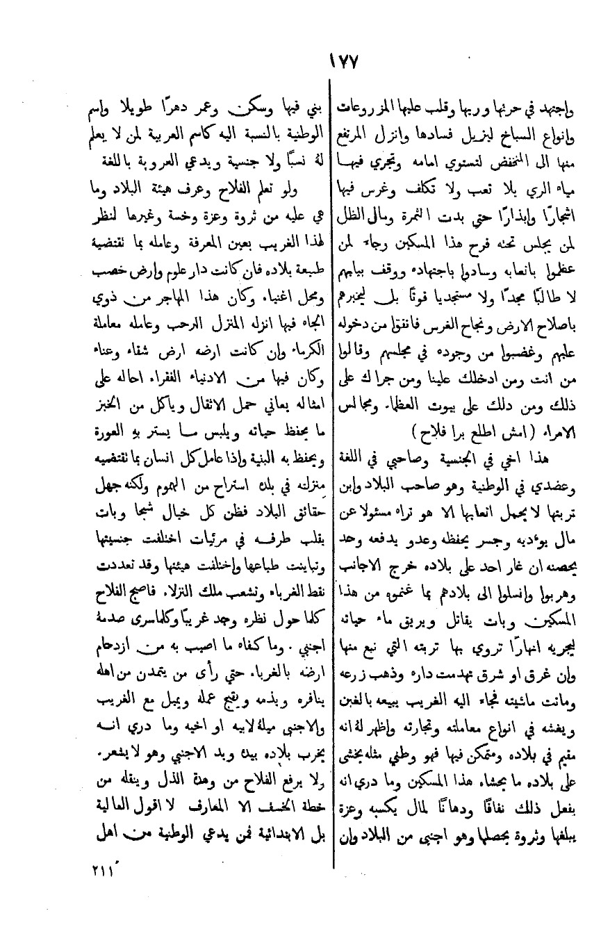 ولو تعلم الفلاح وعرف هيئة البلاد وما هي عليه من ثروة وعزه وخسة وغيرها لنظر لهذا الغريب بعين المعرفة وعامله بما تقتضية طبيعة بلاده فان كانت دارعلو وارض خصب وممل اغنياء وكان هذا المهاجر من ذوي الجاه فيها انزل المنزل الرحب وعامله معاملة الكرماء وان كانت ارضه ارض شقاء وعناء وكان فيها من كانت ارضه ارض شقاء وعناء وكان فيها من الادنياء الفقراء احاله على امثاله يعاني حمل الاثقال وياكل من الخبز مايحفظ حياته ويلبس ما يستر به العورة ويحفظ به البنية واذا عامل كل انسان بما تقتضيه منزلته في بلده استراح من الهموم ولكنه جهل حقائق البلاد فظن كل خيال شجا وبات يقلب طرفه في مرئيات اختلفت جنسيتها وتباينت طباعها واختلفت هيئتها وقد تعددت نقط الغرباء وتشعب ملك النزلاء فاصبح الفلاح كلما حول نظرة وجد غريبا وكلما سرى صدمه اجنبي وما كفاه ما اصيب به من ازدحام ارضه بالغرباء حتى رأى من يتمدن من اهله ينافره ويذمه يقبح عمله ويمل مع الغريب والاجنبي ميله لابيه او اخيه وما دري انه يخرب بلاده بيده ويد الاجنبي وهو لايشعر 0