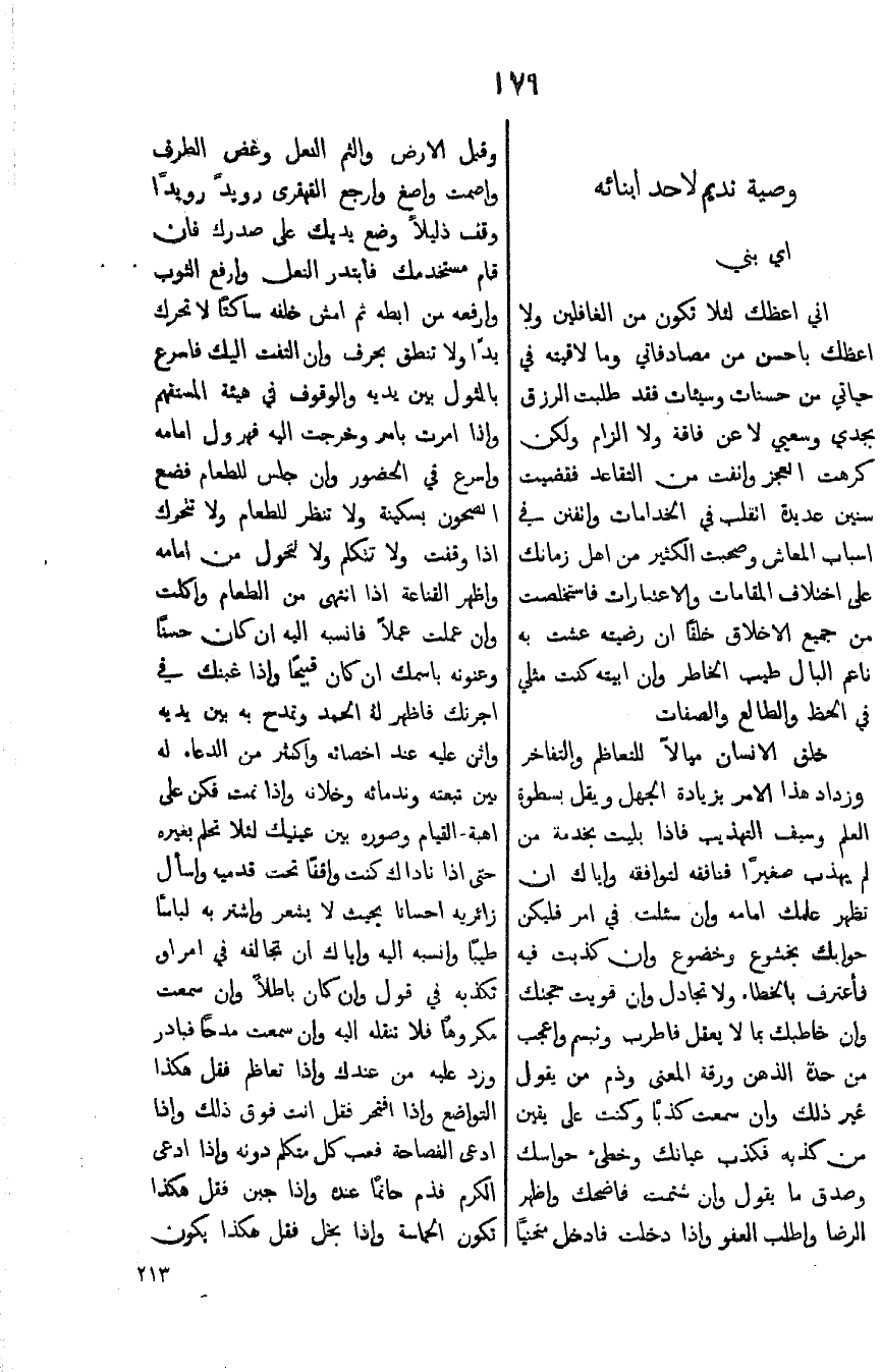 اني اعظك لئلا تكون من الغافلين ولا اعظك باحسن من مصادفاتي وما لاقيته في حياتي من حسنات وسيئات فقد طلبت الرزق بجدي وسعيي لاعن فاقة ولا الزام ولكن كرهت العجز وانقت من التقاعد فقضيت سنين عديدة اتقلب في الخدامات وأتفنن في اسباب المعاش وصحبت الكثير من اهل زمانك على اختلاف المقامات والاعتبارات فاستخلصت من جميع الاخلاق خلقاً ان رضيته عشت به ناعم البال طيب الخاطر وان ابيته كنت مثلي في الخط والطالع والصفات