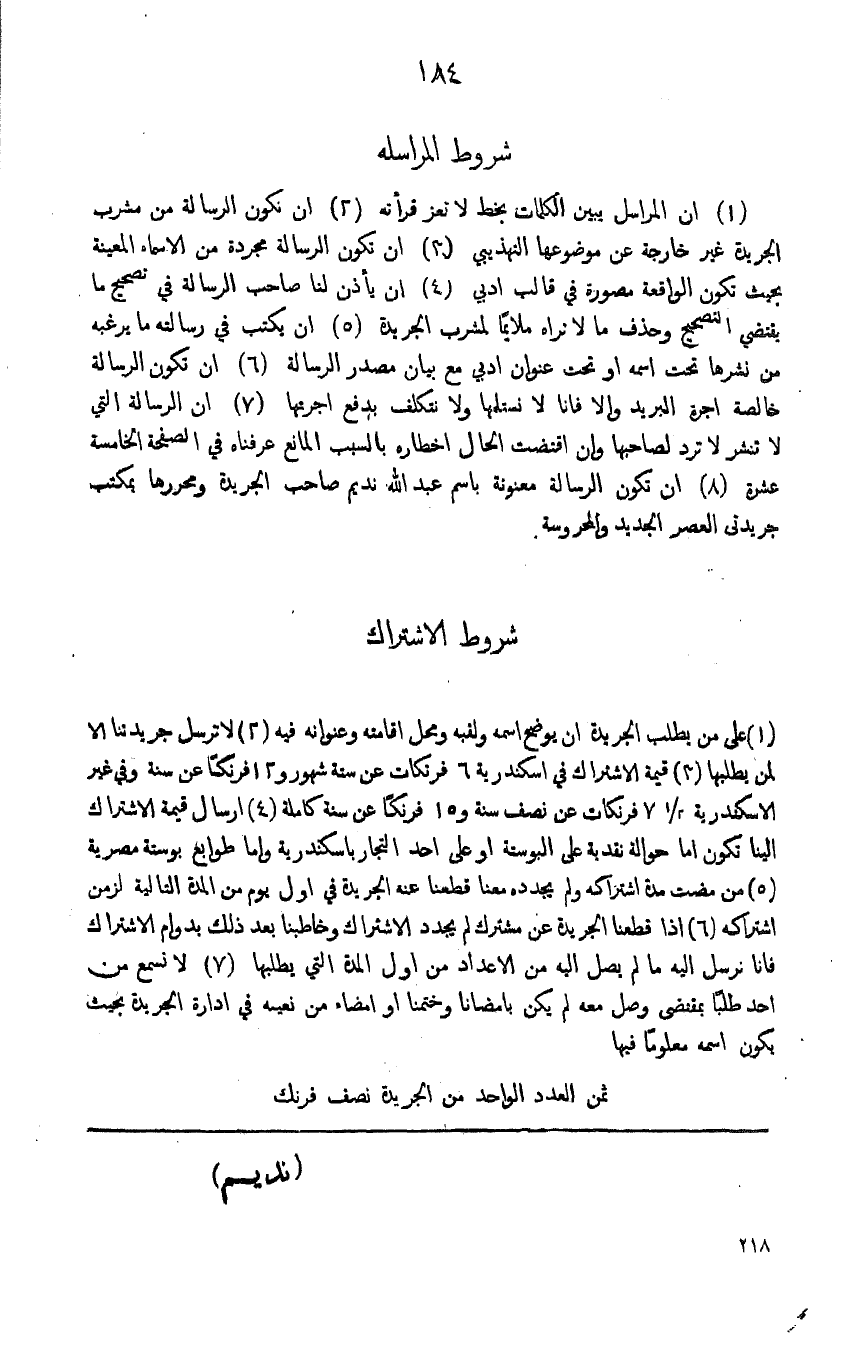 (1) على من يطلب الجريدة ان يوضح اسمه ولقبه ومحل اقامته وعنوانه فيه (2) لاترسل جريدتنا الا لمن يطلبها (3) قيمة الاشتراك في اسكندرية 6 فرنكات عن ستة شهور 12 فرنكا عن سنة وفي غير الاسكندرية 2/ 1 7 فرنكات عن نصف سنة و15 فرنكاُ عن سنة كاملة (4) ارسال قيمة الاشتراك الينا تكون اما حوالة نقدية على البوستة او على احد التجار باسكندرية واما طوابع بوستة مصرية (5) من مضت مدة اشتراكه ولم يجدده معنا قطعنا عنه الجريدة في اول يوم من المدة التالية لزمن اشتراكه (6) اذا قطعنا الجريدة عن مشترك لم يجدد الاشتراك وخاطبنا بعد ذلك بدوام الاشتراك فانا نرسل اليه ما لم يصل اليه من الاعداد من اول المدة التي يطلبها (7) لانسمع احد طلباً بمقتضى وصل معه لم يكن بامضانا وختمنا او امضاه من نعيمه في ادارة الجريدة بحيث يكون اسمه معلوماً فيها