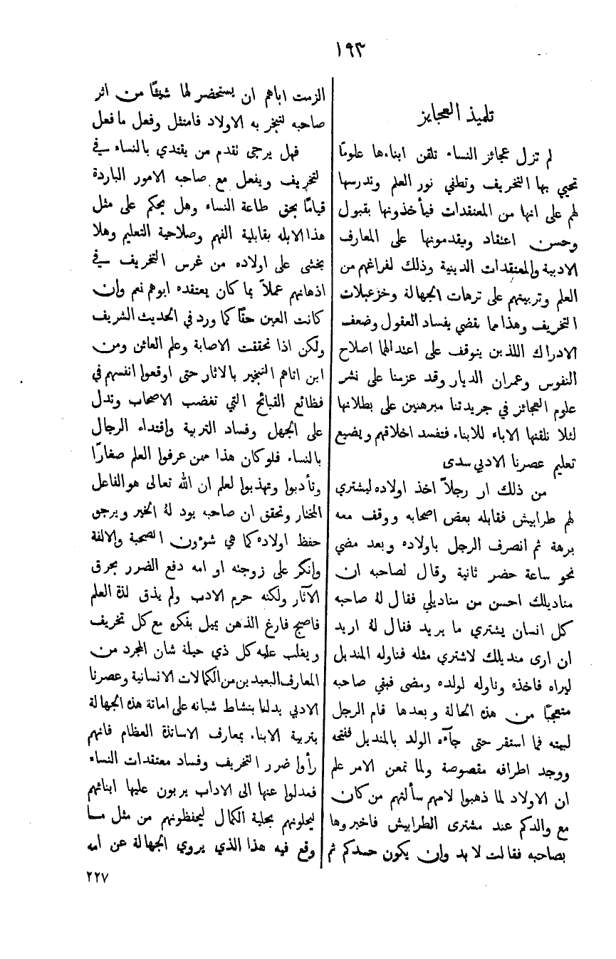 لم تزل عجائز النساء تلقن ابناها علوما تحيي بها التخريف وتطفي نور العلم وتدرسها لهم على انها من المعتقدات فيأخذونها بقبول وحسن اعتقاد ويقدمونها على المعارف الادبية والمعتقدات الدينية وذلك لفراغهم من العلم وتربيتهم على نزهات الجهالة وخزعلات التخريف وهذا مما يقضي بفساد العقول وضعف الادراك اللذين يتوقف اعتدالهما اصلاح النفوس وعمران الديار وقد عزمنا على نشر علوم العجائز في جريدتنا مبرهنين على بطلانها لئلا تلقنها الاباء للابناء فتفسد اخلاقهم ويضيع تعليم عصرنا الادبي سدى