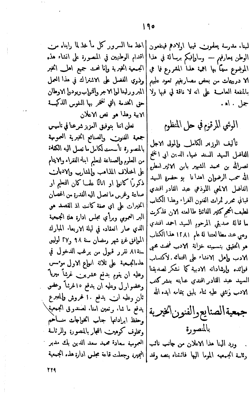 تعلن اننا بتوفيق العزيز شرعنا في تأسيس جمعية الفنون والصنائع الخيرية العمومية بالمنصورة تأسست لكامل ماتصل اليه الكفاءة من العلوم والصناعة لتعليم ابناءالفقراء والأيتام على اختلاف المذاهب والمشارب والأديان ذكوراً كانوا او إناثا علما كان التعليم او صناعة وغرس ما تصل اليه القدرة من أغصان الخيرات على اي صفة كانت إذ القصد هو البر العمومي وبرأي مجلس إدارة هذه الجمعية الذي صار انعقاده في ليلة الأربعاء المبارك الموافق غرة شهر رمضان سنة 98و27لوليو سنة 81 لقرر قبول من يرغب الدخول في هذه الجمعية على ثلاثة أنواع الاول مؤسس وعليه ان يقوم بدفع عشرين غرشا ميريا وعضو اول وعليه ان يدفع 15 غرشا وعضو ثان وعليه ان يدفع 10غروش والمتبرع يدفع ماشاء وتعين أمناء لصندوق الجمعية وحفظ إيراداتها جناب الخواجات من احم ومخلوق كوهين التجار بالمنصورة وللرئاسة العمومية سعادة محمد سعد الدين بك مدير الجيزة وجعلت قاعة مجلس ادارة هذه الجمعية