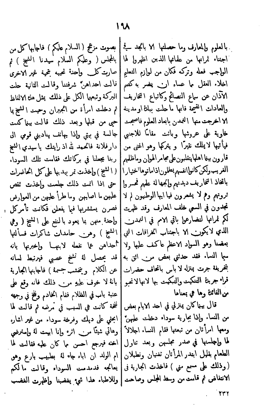بالعلوم والمعارف وما حصلتها الا بالجد في اجتناء ثمراتها من علمائها الذين اظهروا لها الواجب فعله وتركه فكان من لوازم التعليم أخلاء العقل مما عساه ان يضر به كصم الآذان عن سماع النصائح وكإتباع التخاريف والعادات القبيحة فإنها ما حلت ببلدة او مدينة الا أخرجت منها التمدن بإبعاد العلوم فأصبحت خاوية على عرشها وباتت مقاماً للأجنبي فيأتيها لا يملك نقيراً ويتركها وهو أغنى من قارون بينما أهلها يتقلبون على مجامر الهوان وما ظلمهم الغريب ولكن كانوا أنفسهم يظلمون اذا ماتوا ها باختيار التخاريف دينهم والجهالة علمهم فخسروا ثروتهم وهم لا يشعرون فيا ايها الوطنيون لم لا تجدون في السعي خلف المعارف وقد ظهرت لكم ثمراتها لتضارعوا باقي الأمم في التمدن الذي لا يكون الا باجتناب الخرافات التي بعضها وهو السواد الأعظم عاكف عليها ولا سميا النساء فقد حدثني بعض من أثق به بتخريفه جرت بمنزلة لا بأس بإتحاف حضرات قراء جريدة التنكيت والتبكيت بها لأنها لا تجد من الفائدة وما هي بمعناها